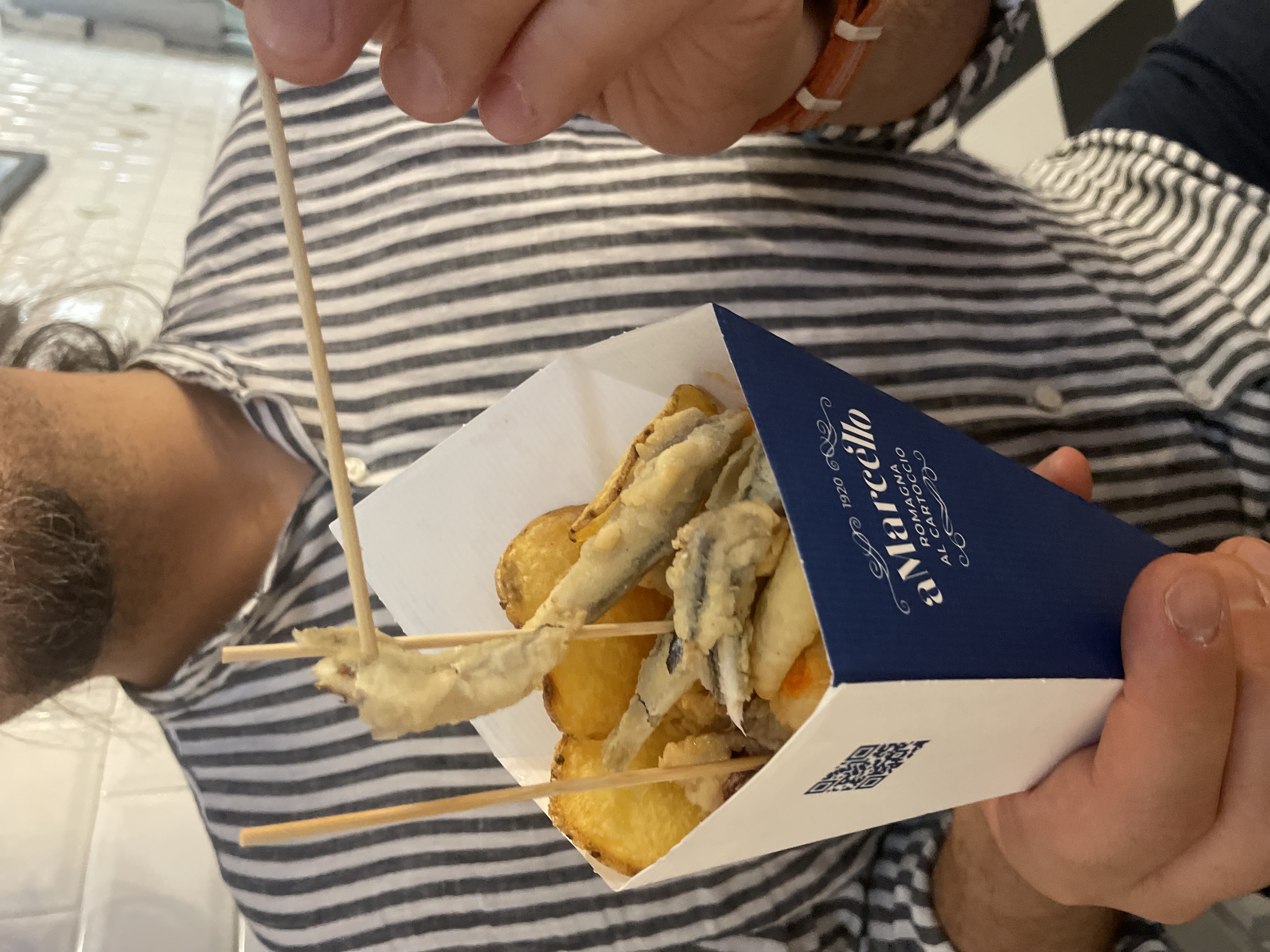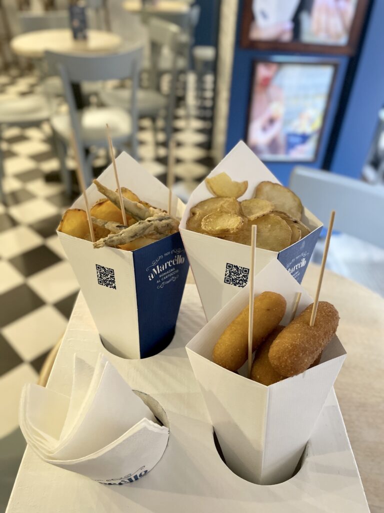 Tra le proposte, il Cono di Gran Fritto di Pesce (con sorpresa finale), le Crocchette di Risotto alla Moda di una volta, le Crocchette di Patate e Baccalà dall’esterno croccante e l’interno morbidissimo, la Crema fritta e le Patatine fritte, quelle vere.