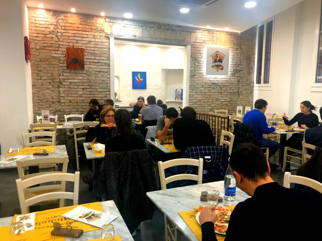 Lunghe code dal lunedì alla domenica per assaggiare una pizza caratterizzata dall’impasto sottile, dai bordi che fuoriescono dal piatto e dal mix di sapori autentici.
