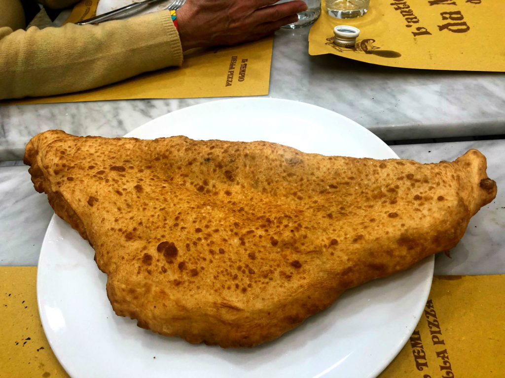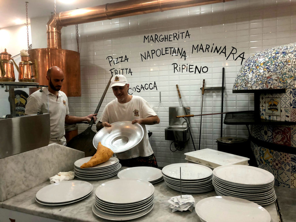 All’ingresso – 90 coperti che arriveranno probabilmente a 130 in primavera – il volto radioso di Julia Roberts sul set del film “Mangia Prega Ama” e un’enorme friggitrice di rame che non lascia spazio ad alcun dubbio: qui è possibile ordinare la vera pizza fritta (disponibile anche nella versione “Ripieno al forno”) con gli ingredienti classici, ovvero cicoli e/o salame di Napoli, fior di latte di Agerola, ricotta di pecora, pecorino DOP, pepe e olio.