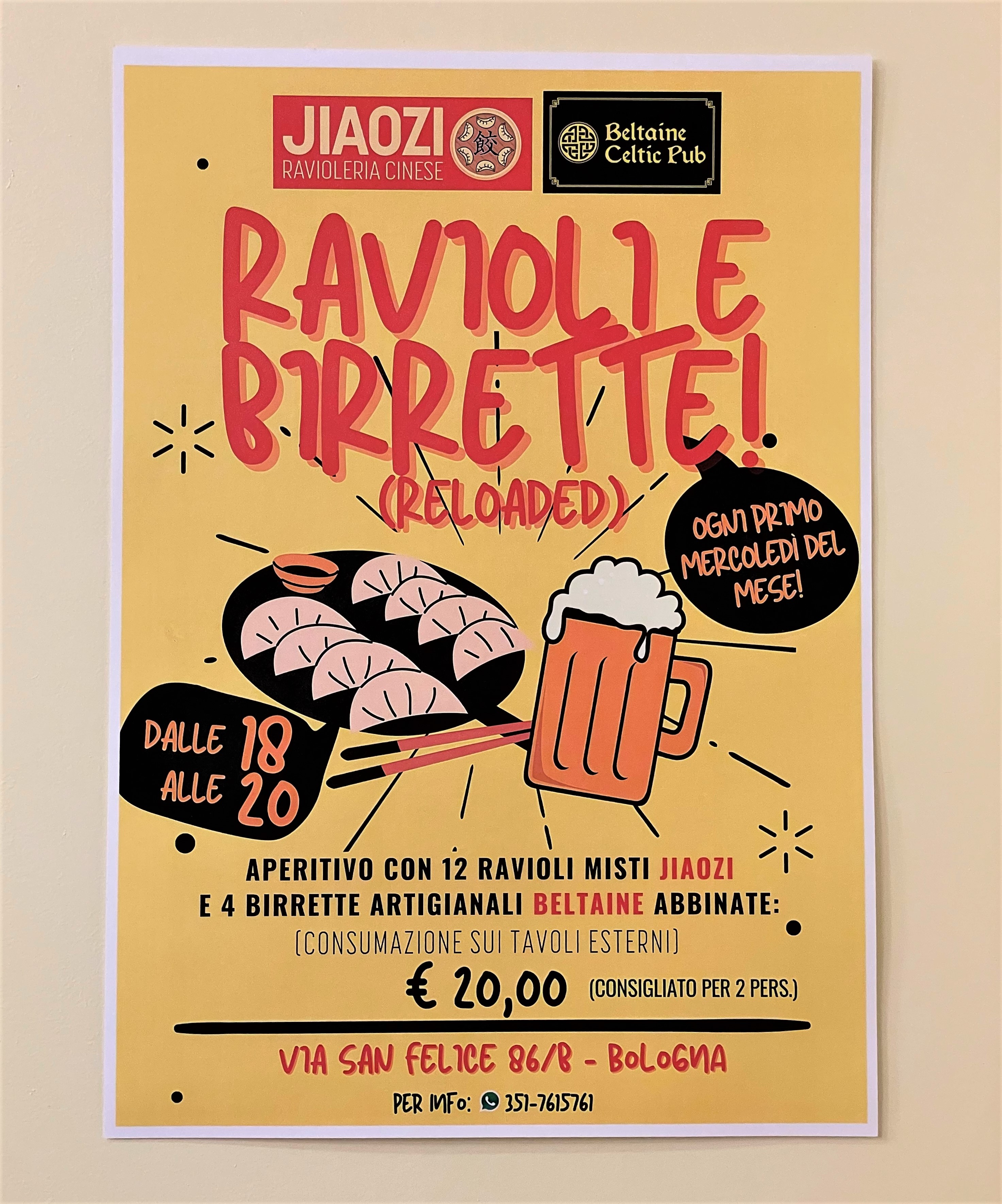 Ogni primo mercoledì del mese, dalle 18 alle 20, il locale in Via San Felice propone Ravioli e Birrette (Reloaded), l’aperitivo in collaborazione con Beltaine Celtic Pub. Cosa prevede? Ben 12 ravioli misti Jiaozi e 4 Birrette artigianali Beltaine abbinate.