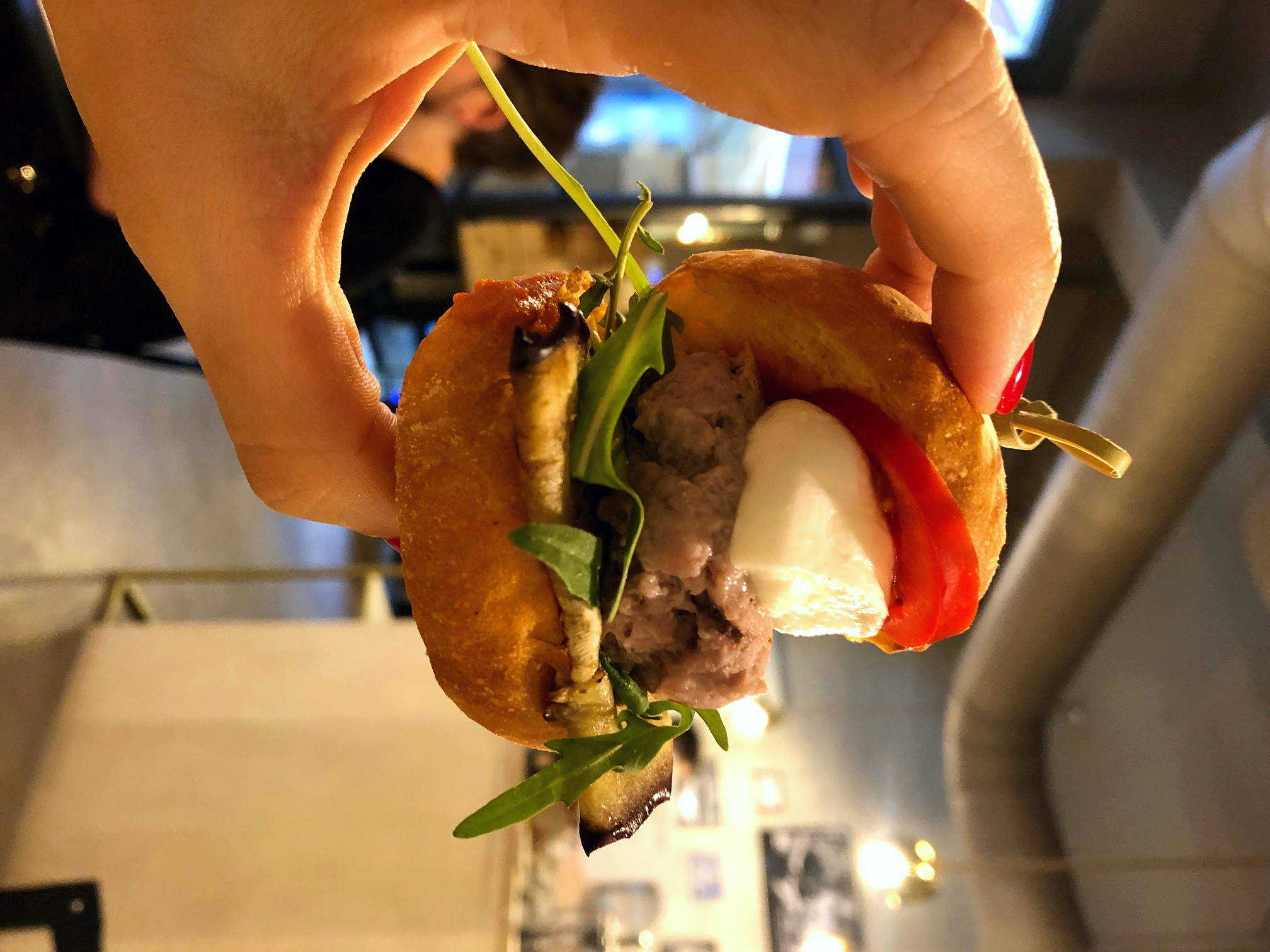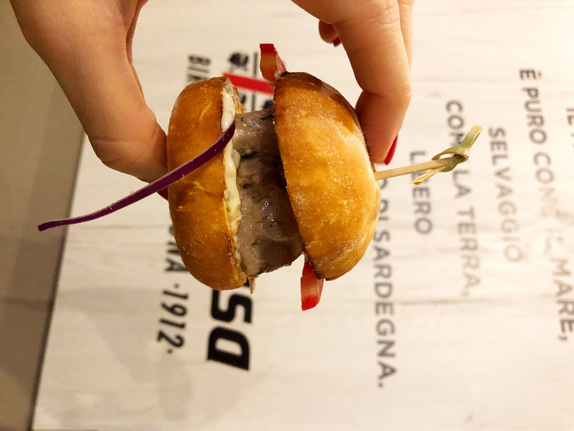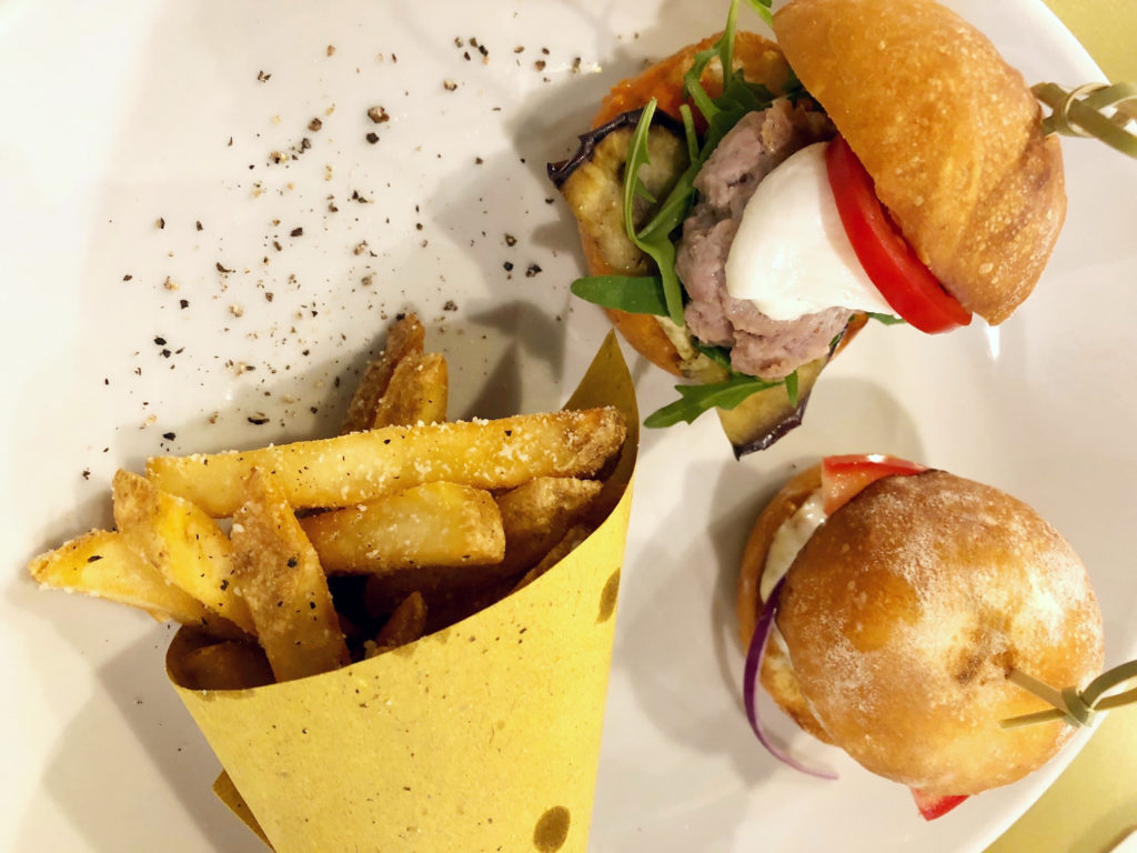Mannali: burger di suino 160 g con salsas Bombas (peperoni, cipolla e panna fresca), melanzane grigliate, rucola, pomodoro fresco e mozzarela di bufala; Muscamari, panino con filetto di tonno 150g marinato al timo, maionese ai capperi, lattuga, pomodoro e cipolla.