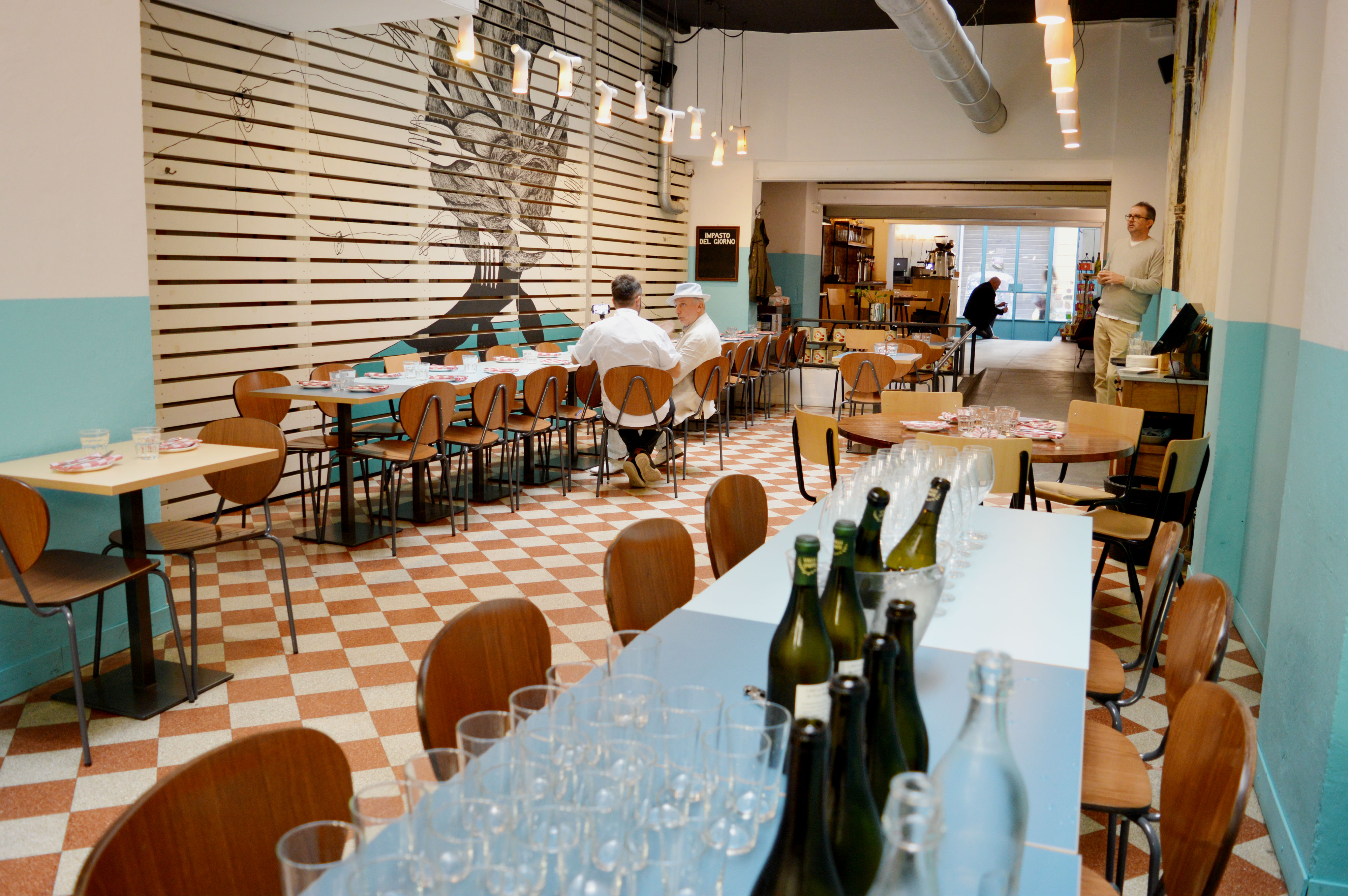 Le pareti del locale, ripulite dalla carta da parati, sono state lasciate appositamente grezze. Via, infine, la bottega con i prodotti biologici, facilmente acquistabili nella sezione shop del sito di Alce Nero. E proprio con il socio del progetto dal 2015 rimane forte la collaborazione per la fornitura delle materie prime e lo sviluppo di farine semintegrali coltivate e lavorate ad hoc.