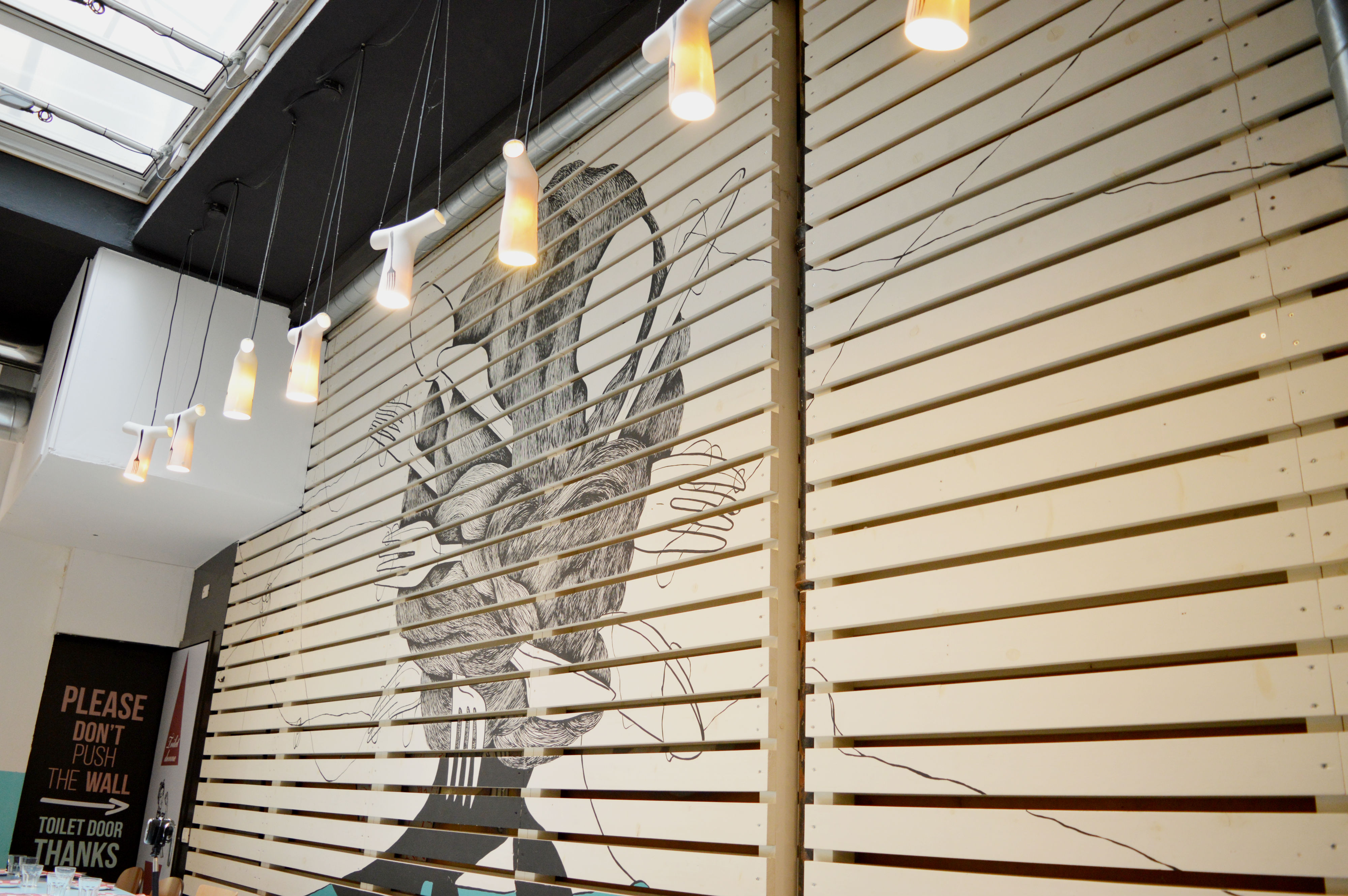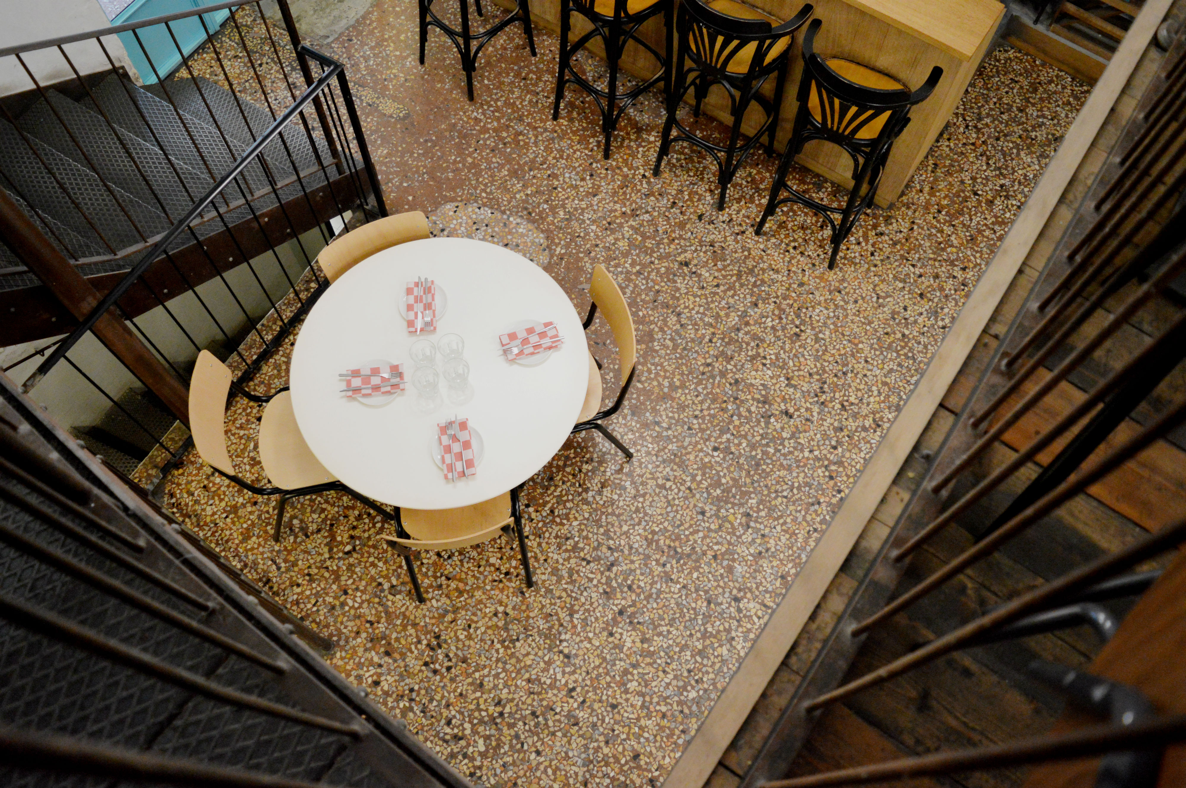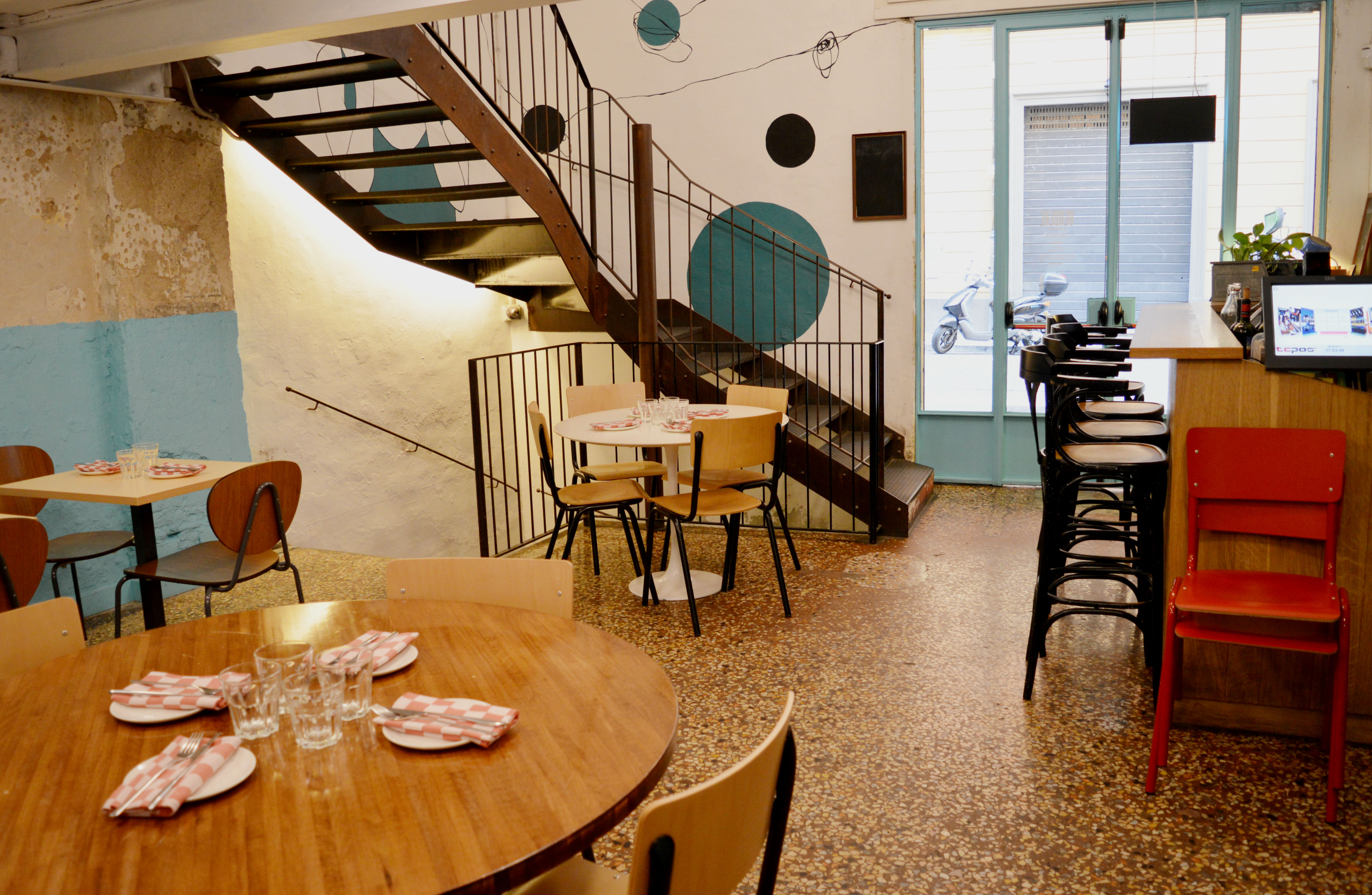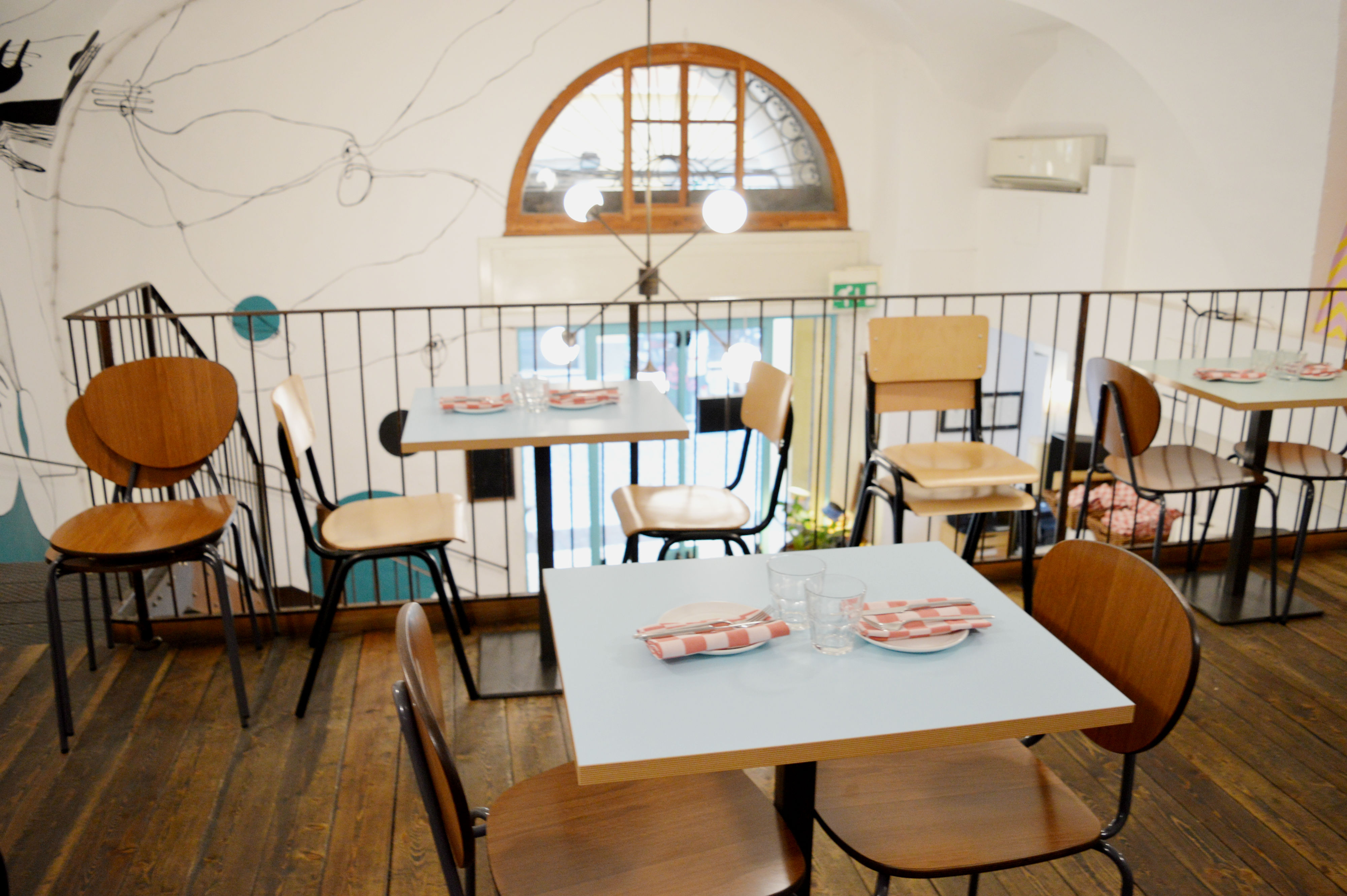 All’esterno, le vetrine sulla strada sono state ritinteggiate di azzurro vivo, cavalcando lo stile tipico delle botteghe inglesi, così da sottolineare lo stile pop del locale. Via i suppellettili e tutti i colori scuri che caratterizzavano le pareti: il soffitto a soppalco è stato tinteggiato di bianco. Per i tavoli, piani in formica di tonalità azzurro, carta da zucchero, giallo chiaro e verde. Anche le sedie, tutte di legno, hanno sostituto le sedute colorate di un tempo.