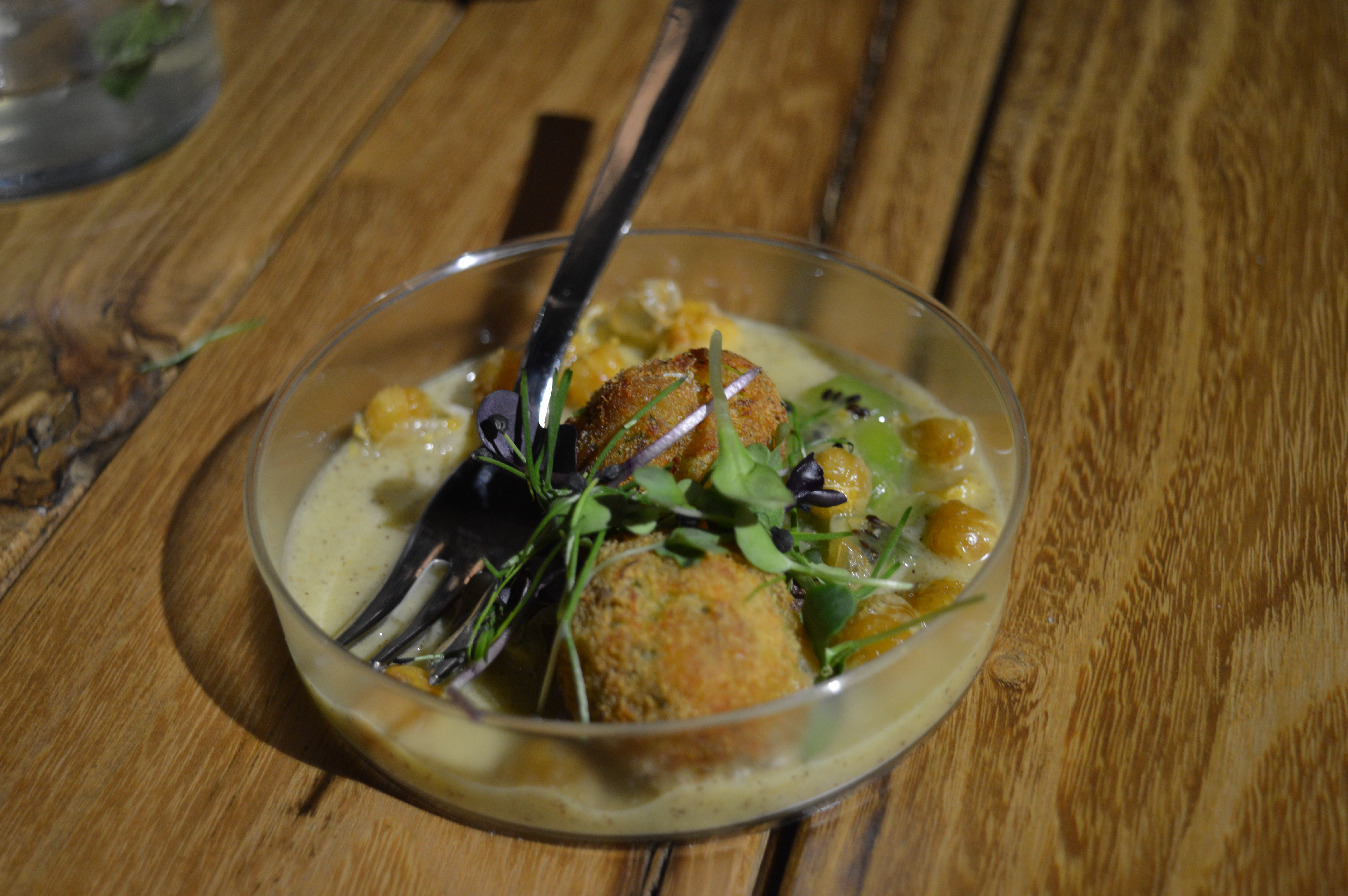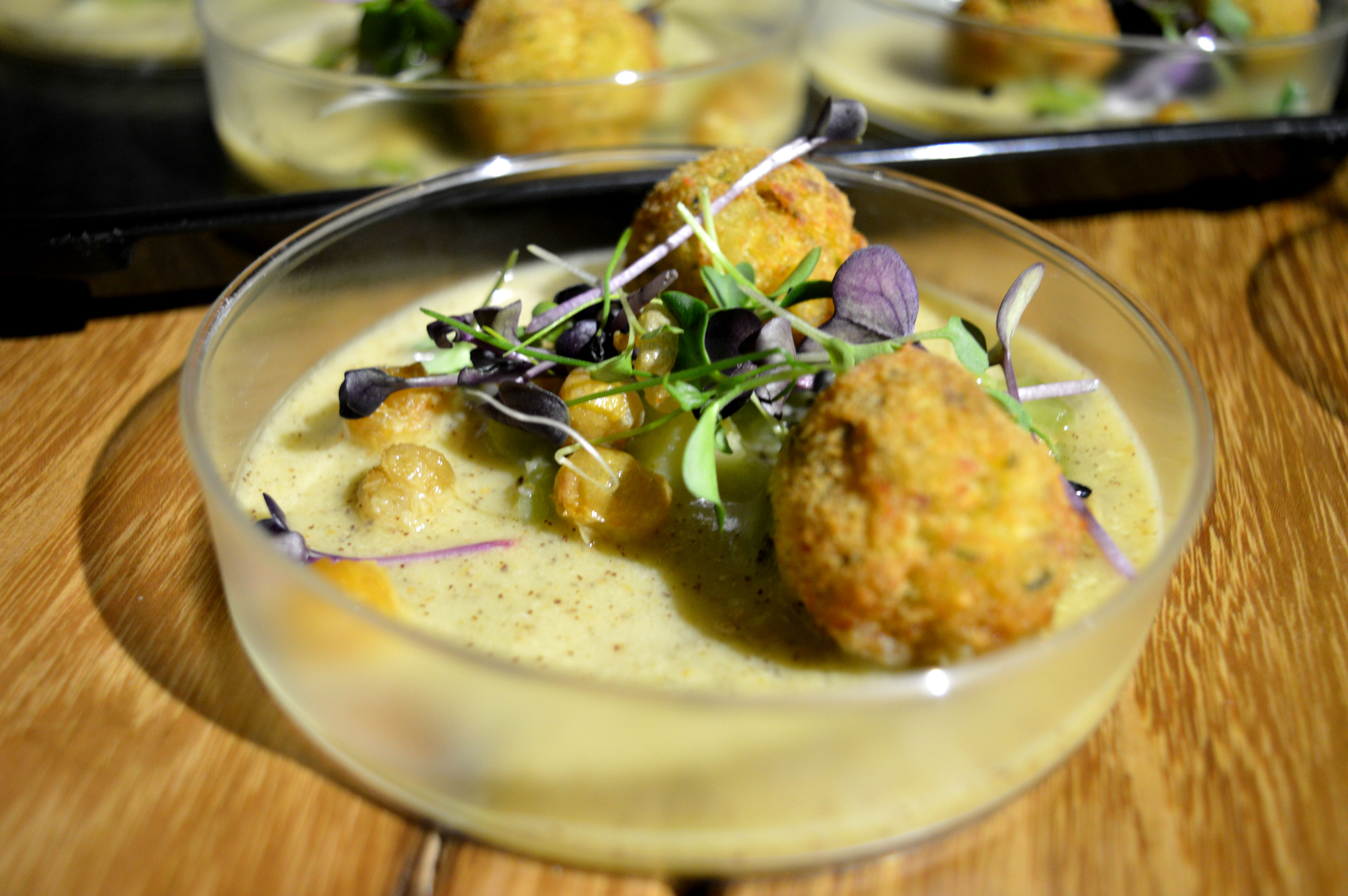 Cosa abbiamo assaggiato? Polpette di melanzane con pane carasau, fregola croccante, vinaccia, ravanelli e stracciatella di burrata; Polpette di mozzarella con bavarese al pomodoro, acciuga e gelato al basilico; Polpette di polpo e patate con spuma di cipolla e marmellata di pomodori secchi; Polpette di merluzzo con salsa al kiwi e ceci croccanti; Polpette di carote e zenzero con crema di mandorle e “terra” di pane affumicato; Polpette di manzo e suino su crema di piselli e coulis di Pomodoro con scalogno croccante; Polpette croccanti con chips di patate e fondo bruno.