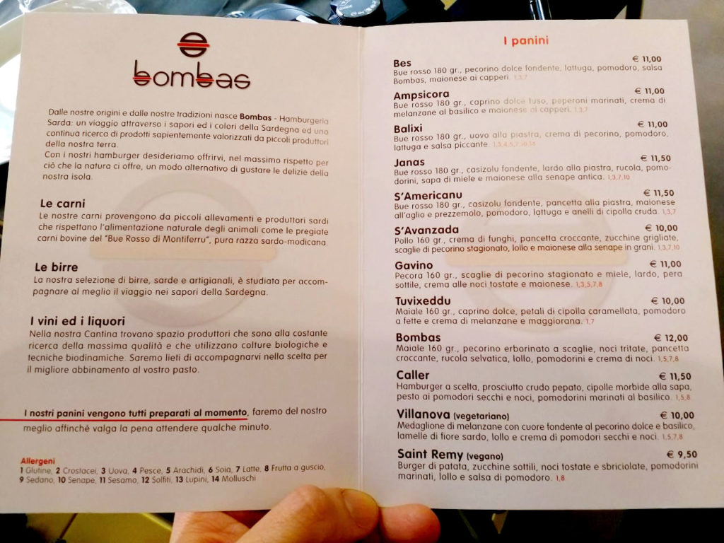 D-O-D-I-C-I. Come Bes (Bue rosso 180 gr., pecorino dolce fondente, lattuga, pomodoro, salsa Bombas, maionese di capperi), Ampsicora (180 gr. di bue rosso, caprino dolce fuso, peperoni marinati, crema di melanzane al basilico e maionese ai capperi), S’Avanzada (Pollo 160 gr., crema di funghi, pancetta croccante, zucchine grigliate, scaglie di pecorino stagionato, lollo e maionese alla senape in grani), Gavino, in omaggio all’artista Gavino Sanna (Pecora 160 gr., scaglie di pecorino stagionato e miele, lardo, pera sottile, crema alle noci tostate e maionese), Bombas (Maiale 160 gr, pecorino erborinato a scaglie, noci tritate, pancetta croccante, rucola selvatica, lollo, pomodorini e crema di noci).