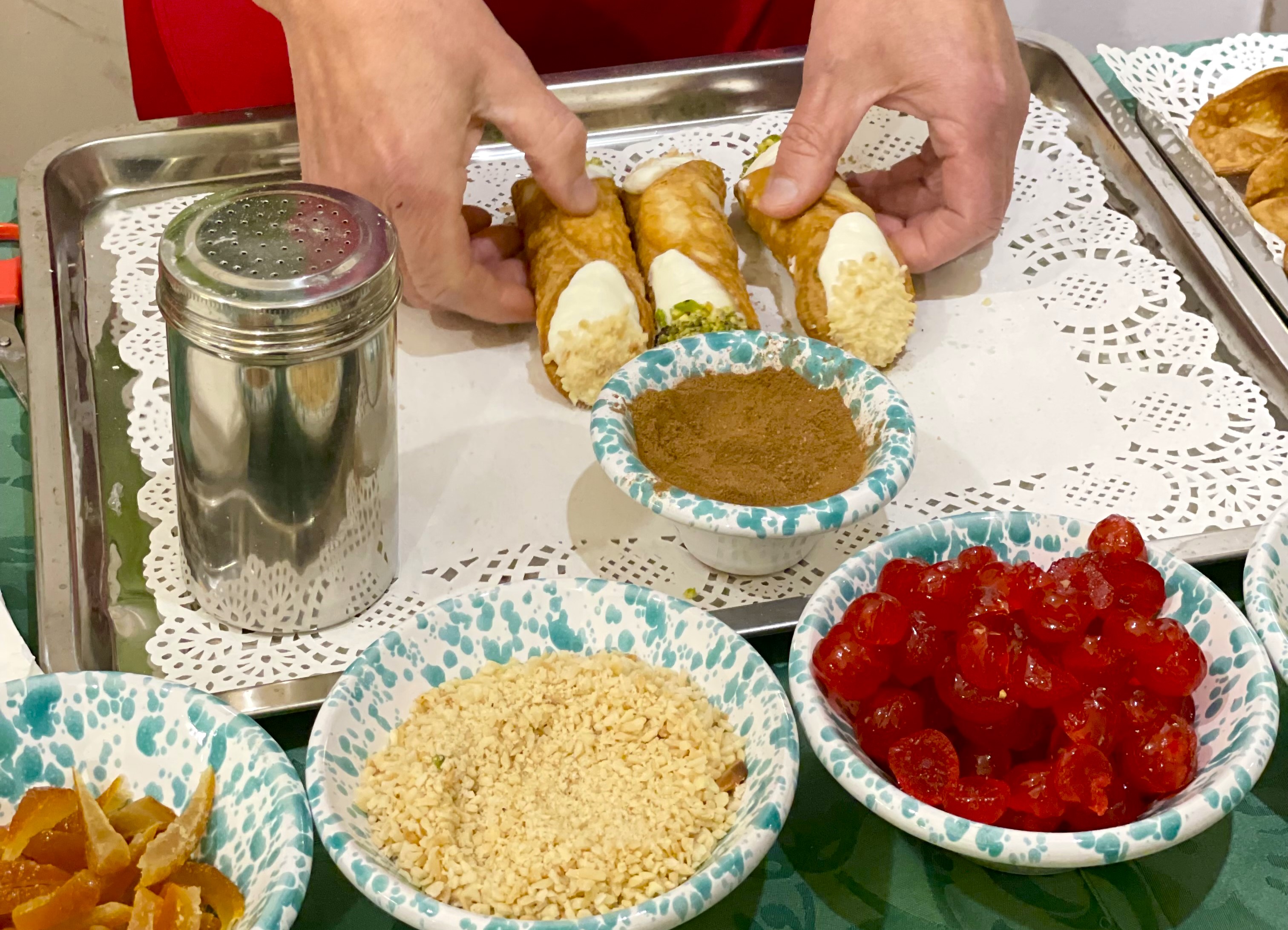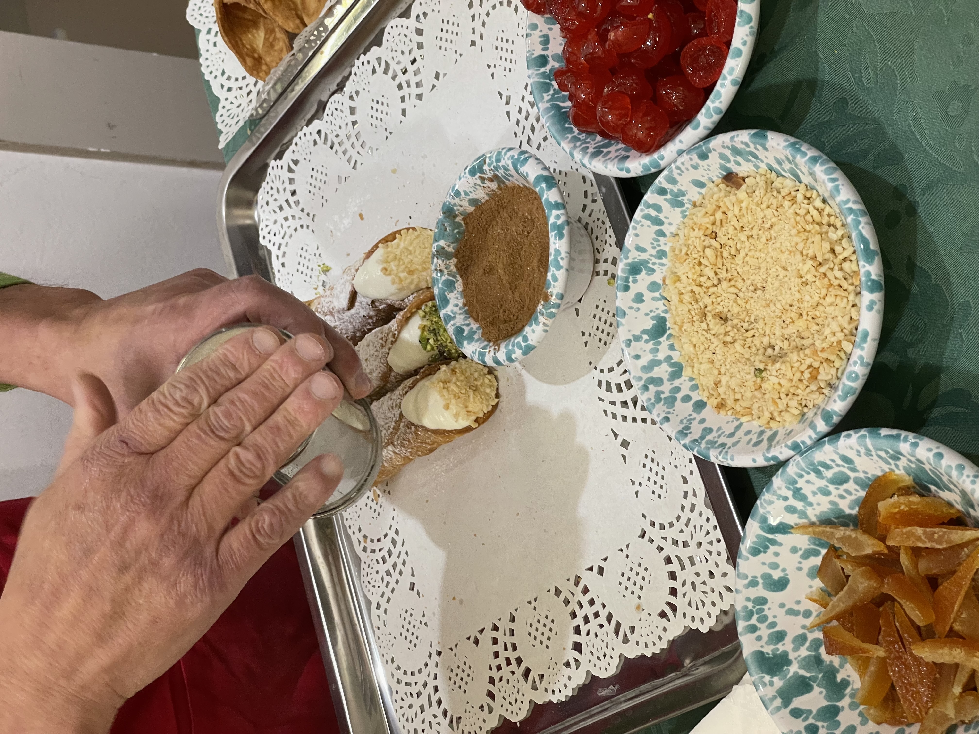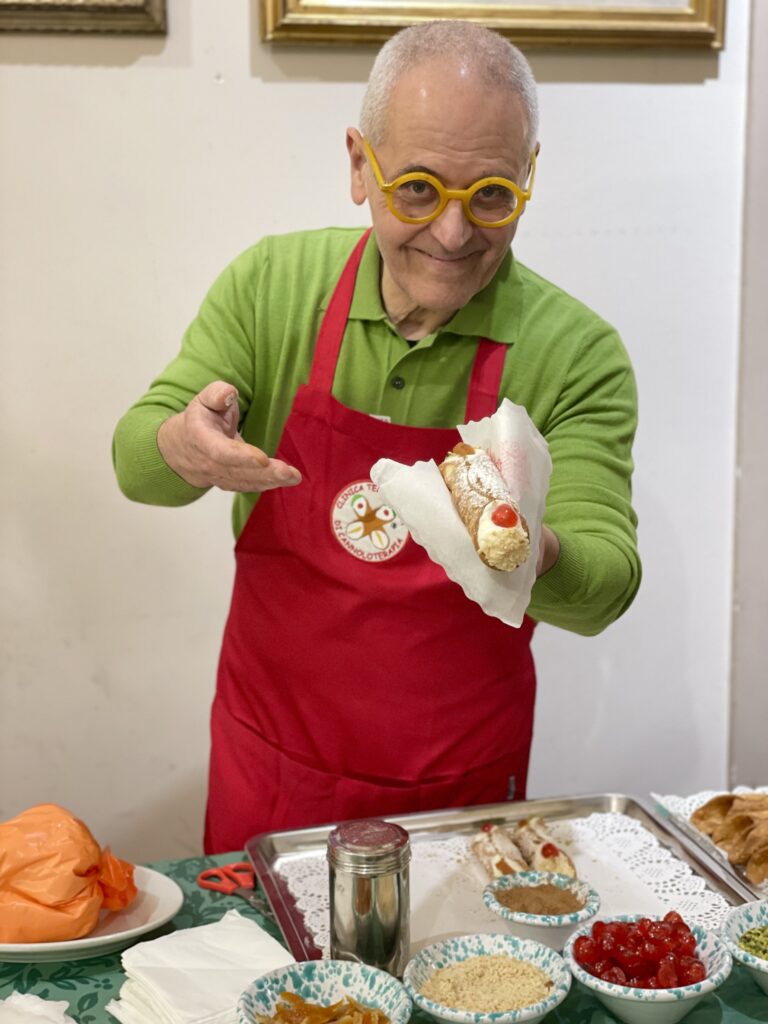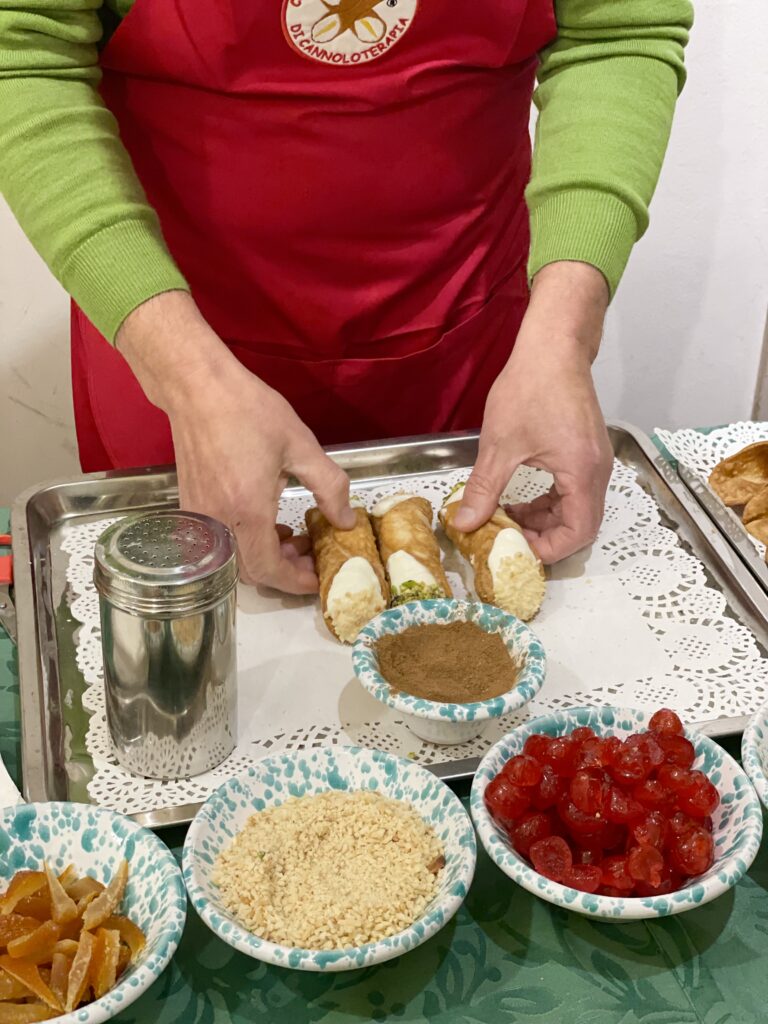 Il cannolo viene preparato con le scorze, fresche sfoglie voluttuosamente croccanti; la ricotta, in quota variabile di pecora e vaccina, lavorata con un minimo di zucchero; la granella di mandorla, rigorosamente di Avola nella qualità pizzuta; la granella di pistacchio siciliano; le arance e le ciliegie candite per la decorazione; lo zucchero a velo; la cannella. Non mancano i racconti di Franco sui passaggi, il significato, la natura delle materie prime utilizzate, e non solo.