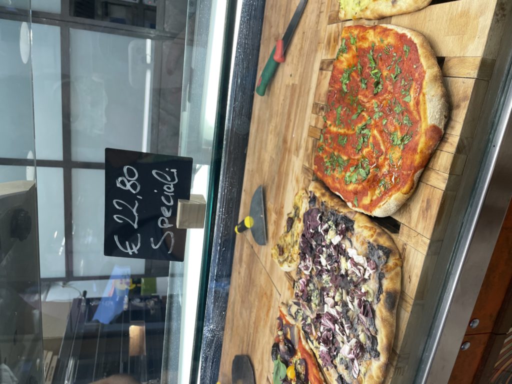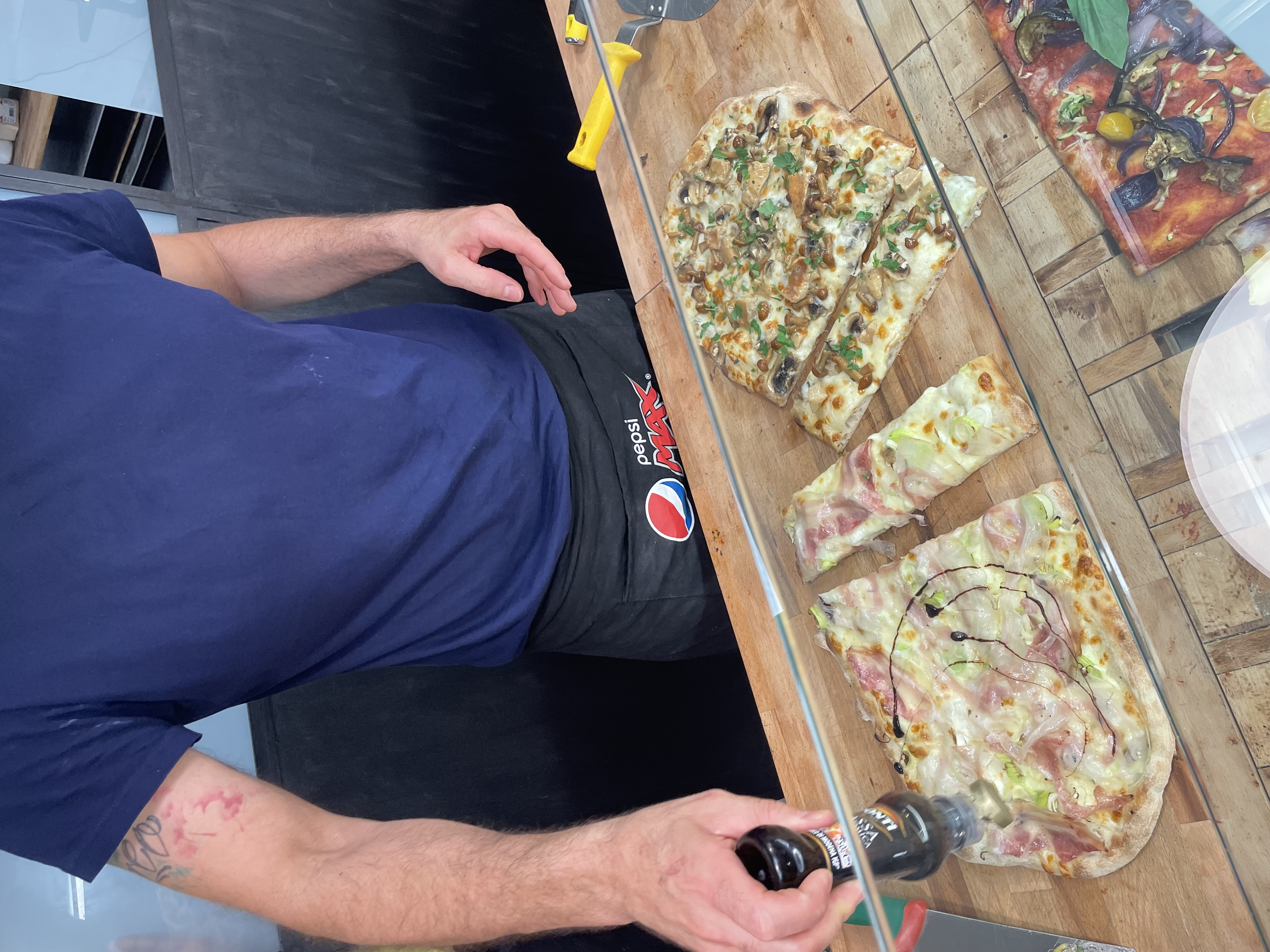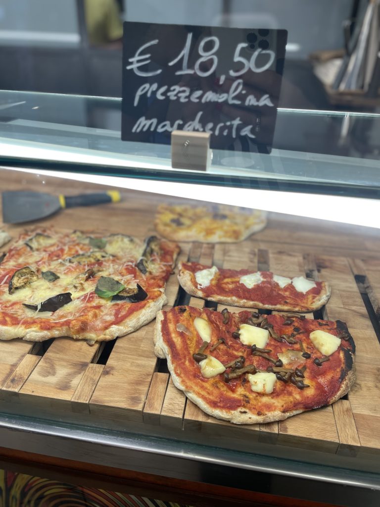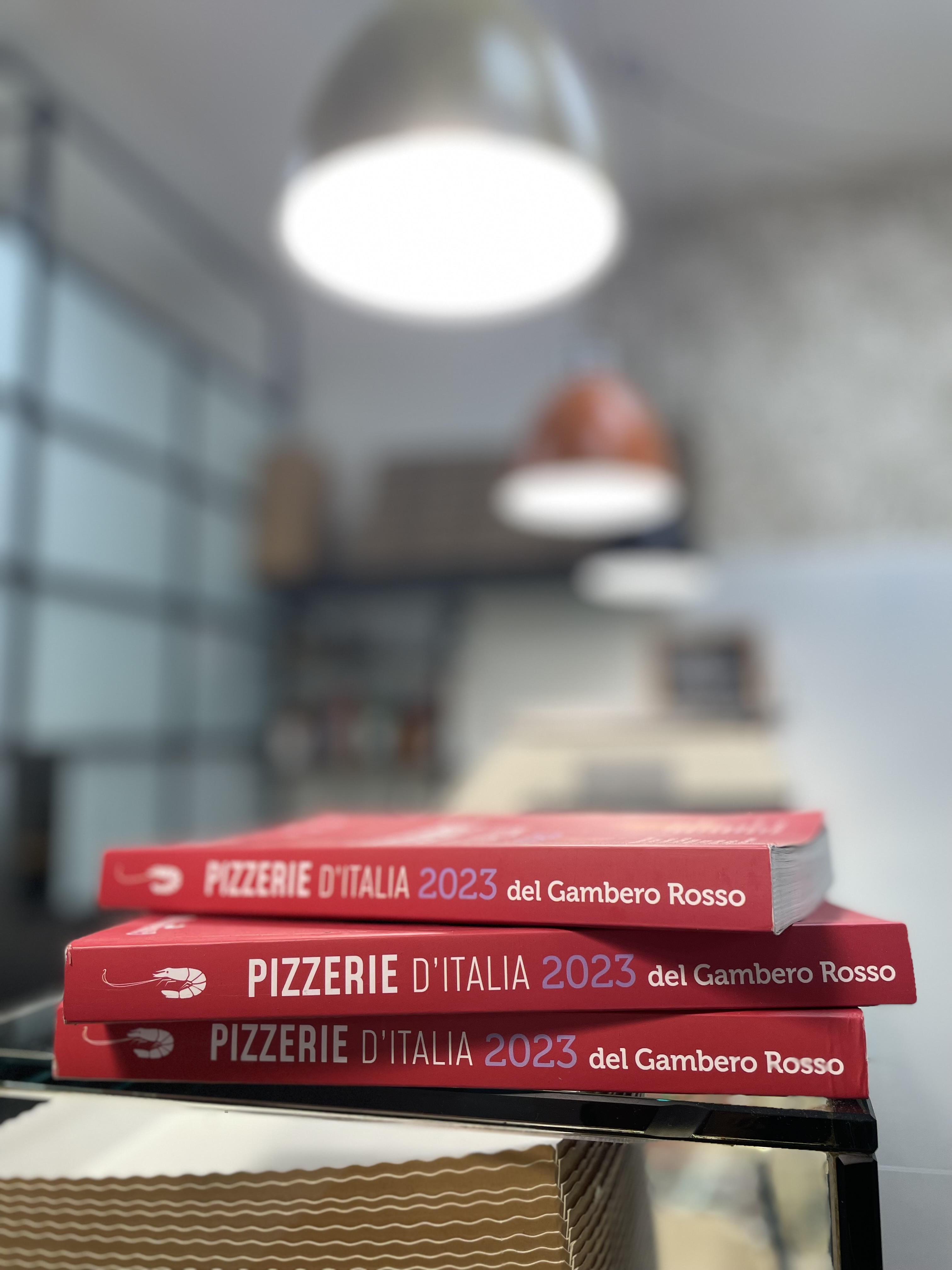 Le pizze sono realizzate con una miscela di farine Tipo 0, Tipo 1, Tipo 2, semola rimacinata e farina di riso con 80% di idratazione e raggiungono una maturazione di 24 ore. Così leggere e croccanti da essere menzionate, già nel primo anno di apertura, nella Guida alle Pizzerie d’Italia 2023 del Gambero Rosso.
