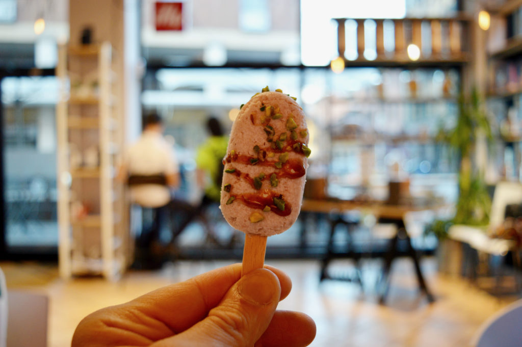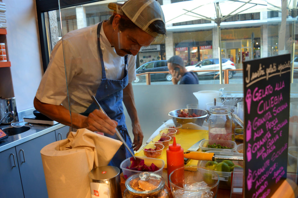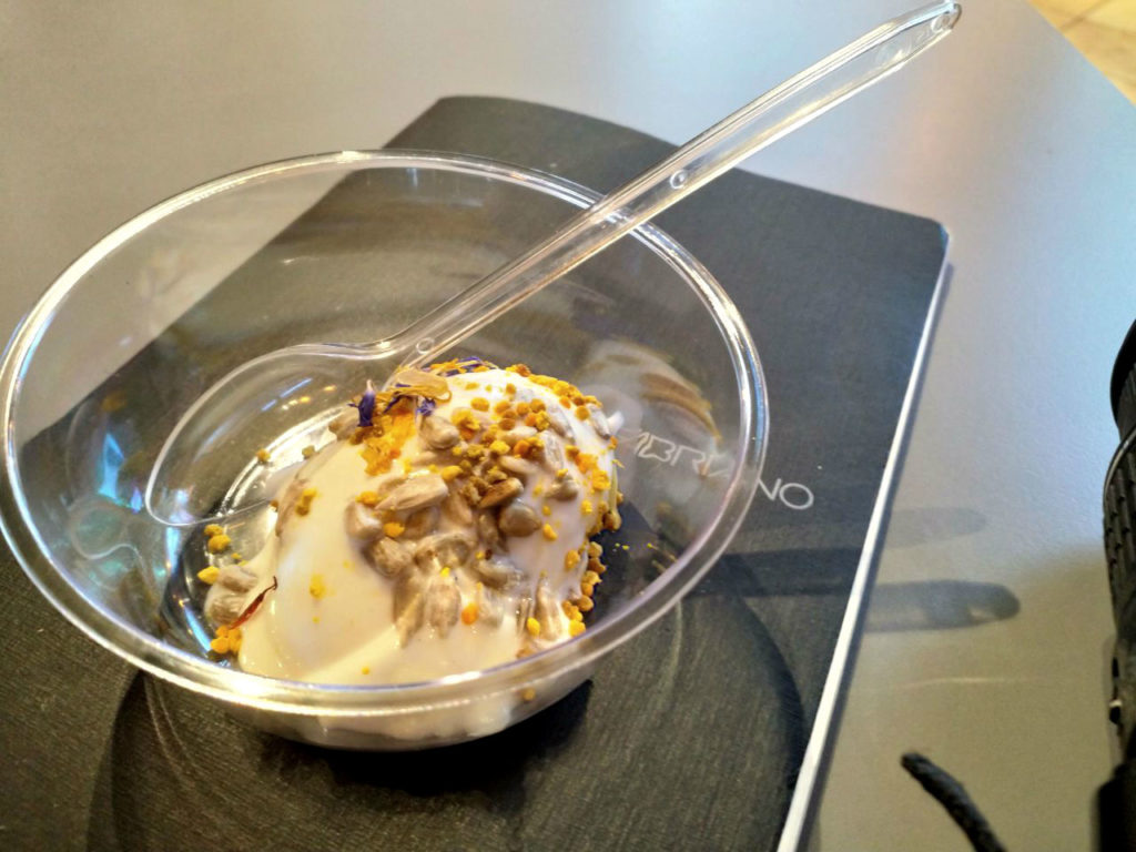 Fortunati, noi, a provare il gelato gastronomico con Niccolò all’opera. “Rosso, Rosso e Campari”: pane al pomodoro, barbabietola agrodolce, granita al Campari e ravanelli; “Mojito di Asparagi”: cous cous all’acciuga, asparagi, gelato aglio e lime, menta; Gelato salato alla mortadella con pistacchi e aceto balsamico; Gelato al Gorgonzola, polline e semi di girasole.Parlando di gelato, “la concorrenza a Bologna è fortissima per numero e qualità delle alternative. A nostro parere il gelato gastronomico rappresenta una nicchia che deve ancora essere esplorata appieno, forse anche perché è sempre rimasta appannaggio di pochi chef in ristoranti di alto livello e gelatieri che però non hanno il locale che permette l’accostamento a piatti veri e propri, se non in occasioni speciali. Cialda vuole essere soprattutto uno spazio in cui i due mondi – cucina e gelato – possano incontrarsi, contaminarsi, incrociare la gente su base quotidiana e raccogliere pareri per crescere”.