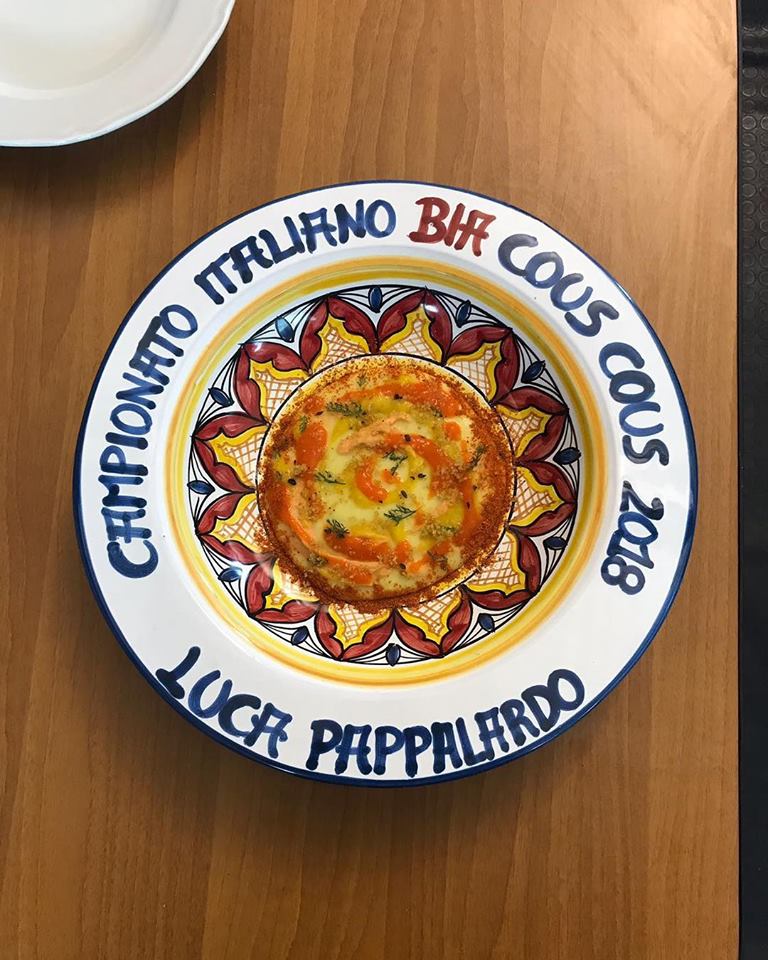 Fra le pietanze proposte nel menu della serata anche “Solaris”, il piatto che ha stregato i giudici del Campionato tenutosi a San Vito, portando lo chef Pappalardo sul podio al secondo posto nella competizione. Solaris è una crema di cous cous all’astice, peperoni, polvere di peperoni cruschi e achillea dalla consistenza morbida ma che sorprende il palato grazie alla croccantezza data dai chicchi di cous cous cotti al forno insieme alla cannella e sparsi sulla crema. Ad accompagnare la cena una proposta selezionata di vini, sia bianchi che rossi, mentre a chiudere la cena un dolce sempre a base di cous cous.