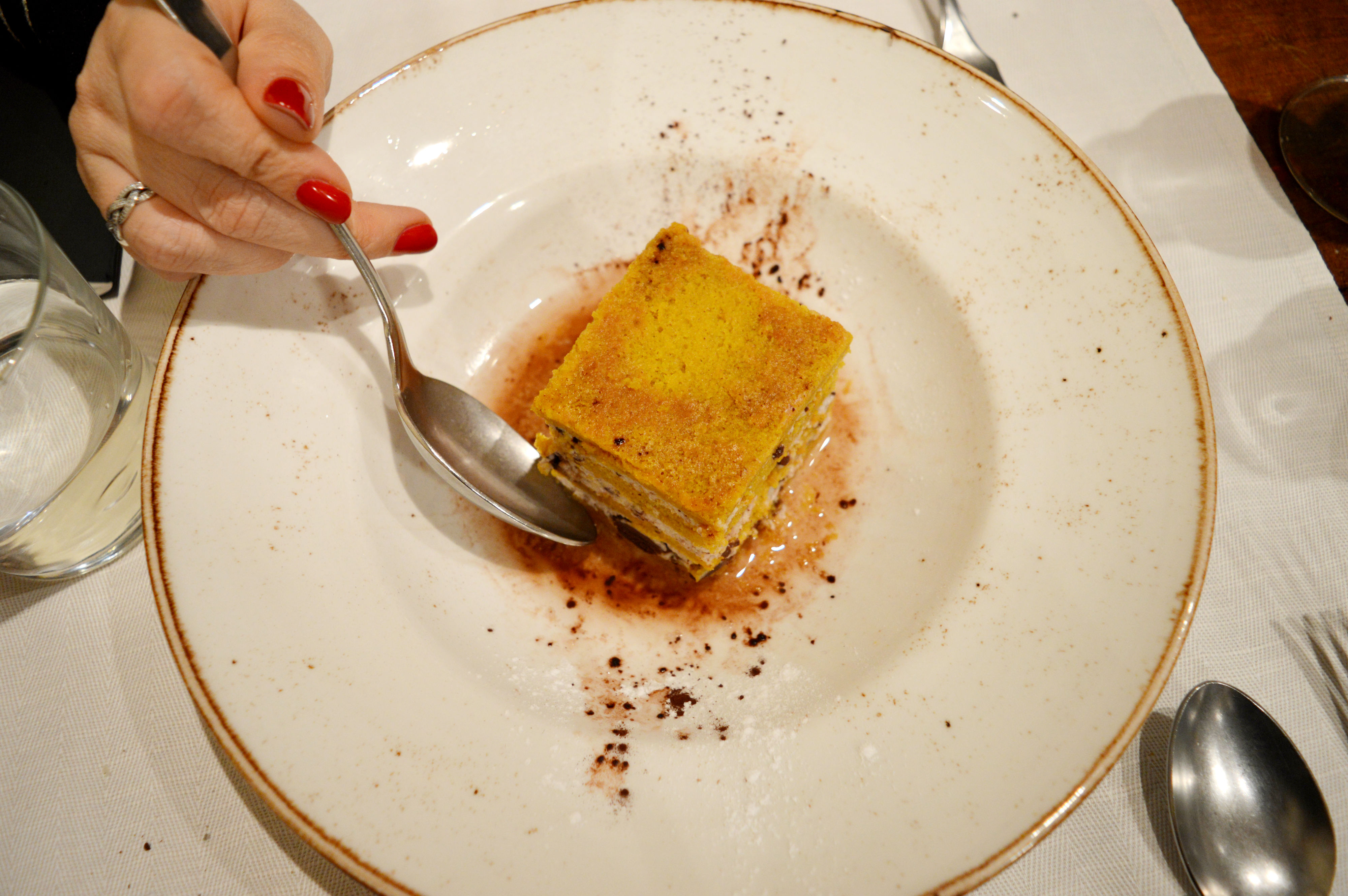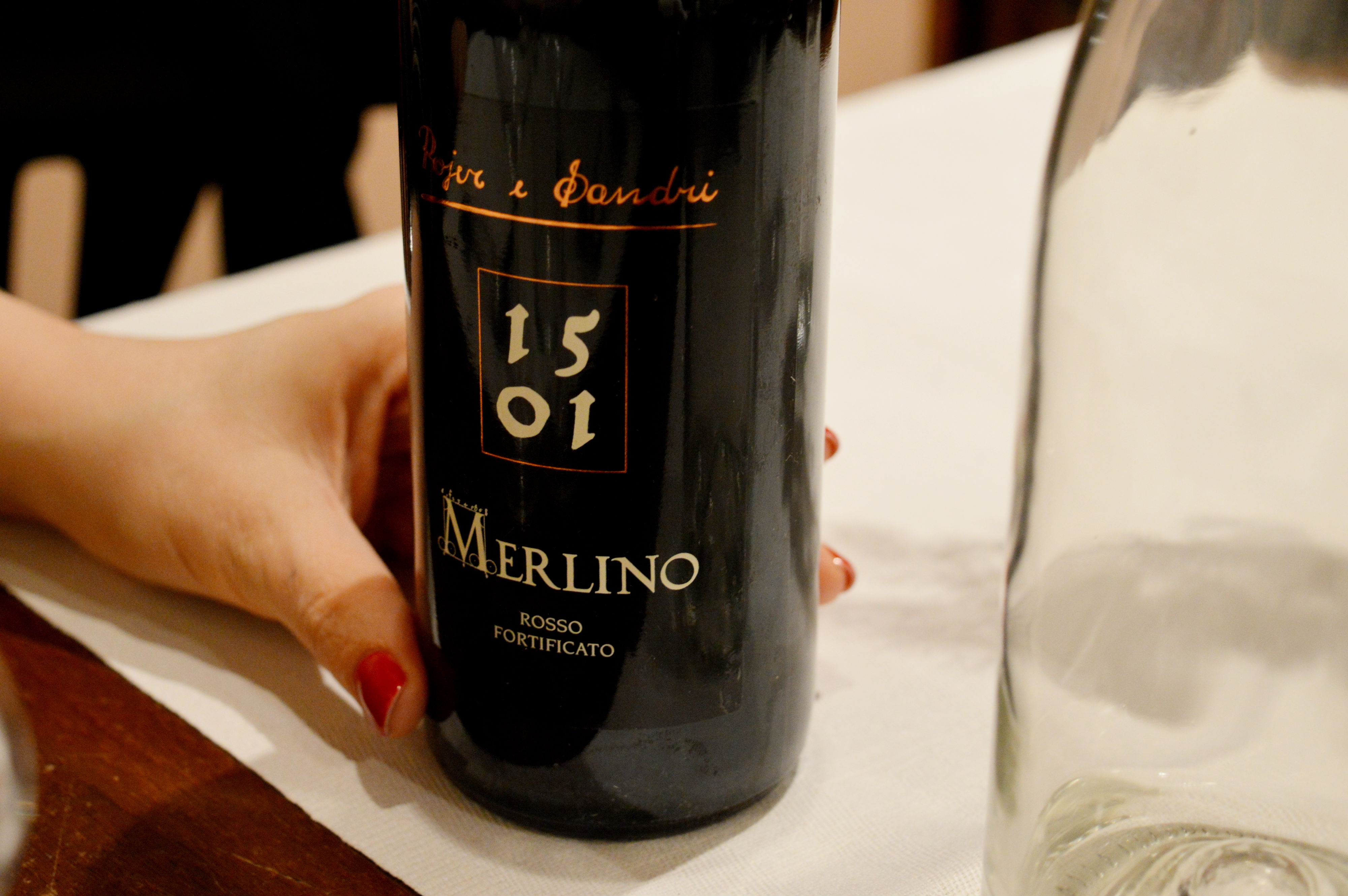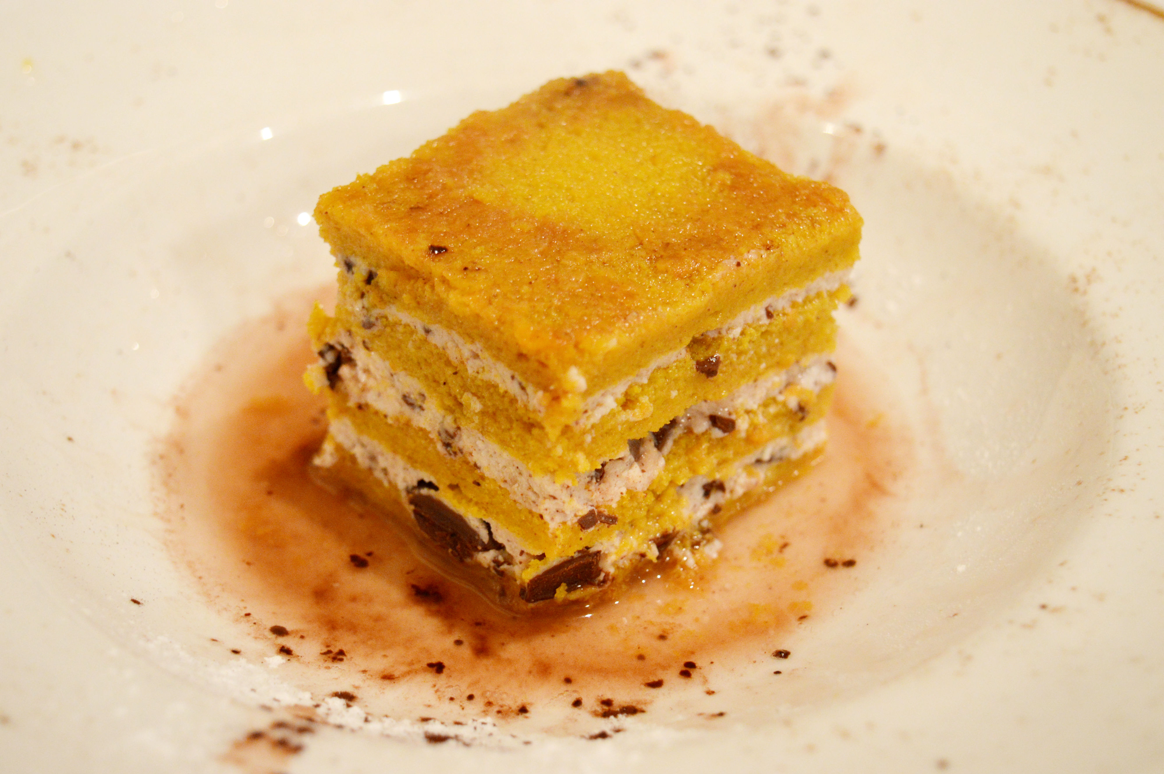 Per la nota finale, ci siamo lasciati sorprendere da Pasquale: Pan di zucca con ricotta, cannella, scaglie di cioccolato, servito con decotto di agrumi. Ad accompagnare il dessert, Merlino Pojer e Sandri di Faedo (Trento): nasce da mosto parzialmente fermentato di uve Lagrein con aggiunta di brandy dell’azienda a sua volta ottenuto da due varietà di uva locali, la schiava e il lagarino.
