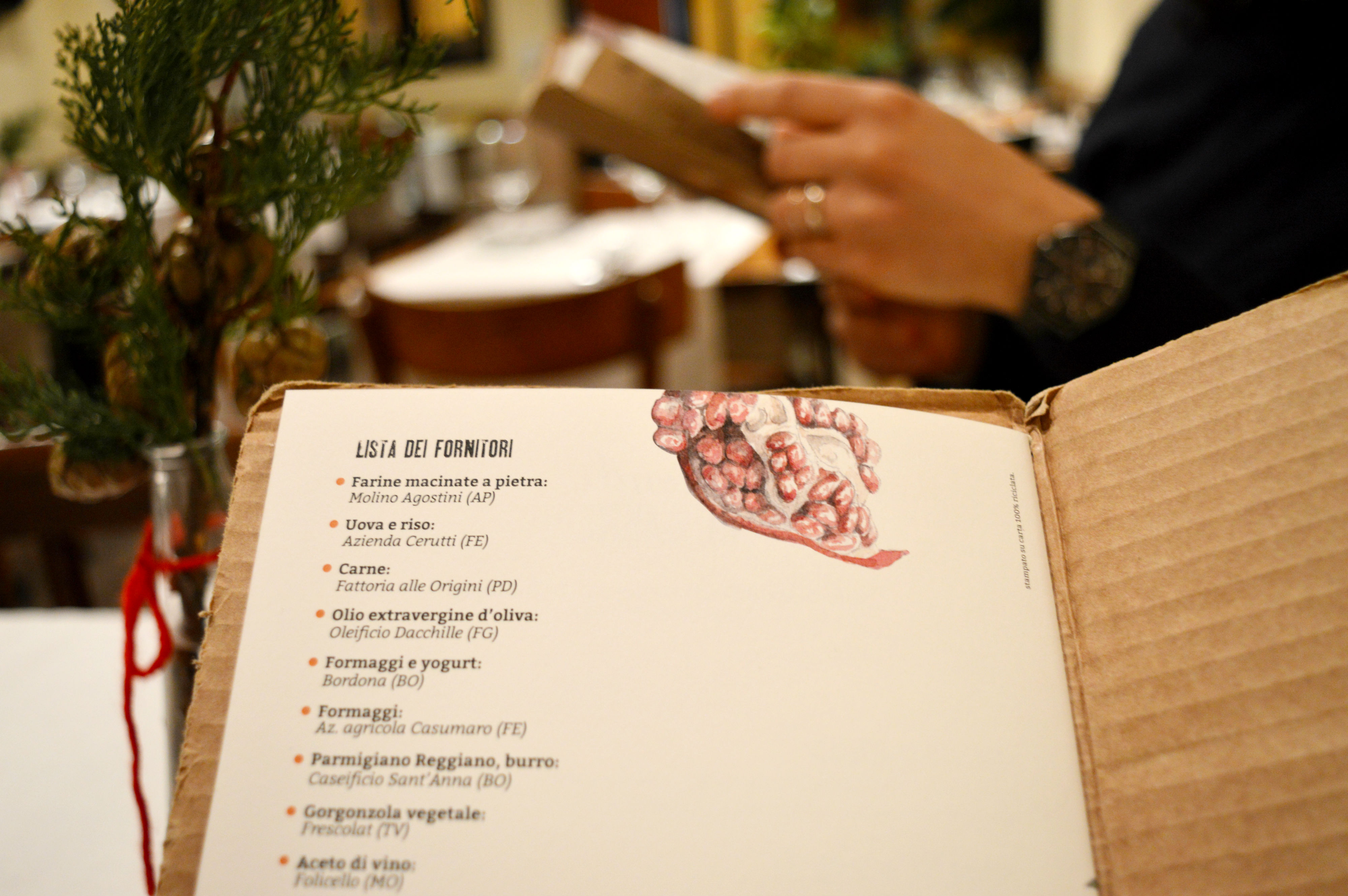 Apriamo il menù, vestito dal cartone riciclato delle bottiglie di vino e dai disegni dell’illustratrice Marina Cremonini.