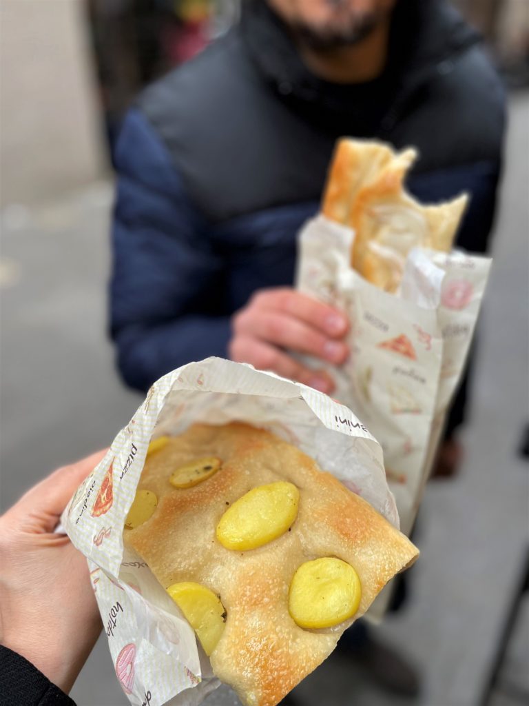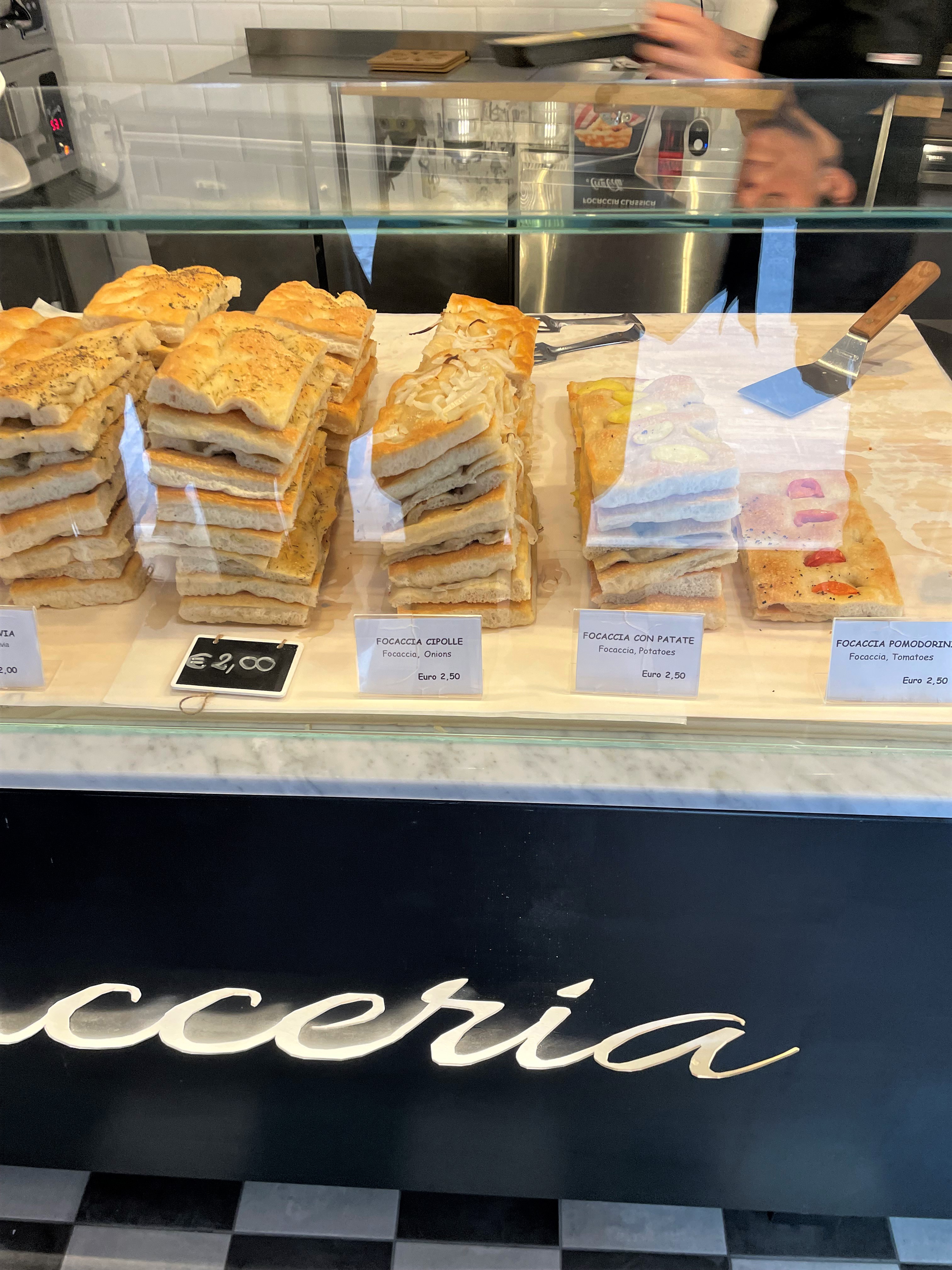 La nostra veloce pausa pranzo si è consumata tra focacce soffici e croccanti proposte in tantissime varianti: quella con le cipolle, la focaccia con le patate, la versione con le olive, pomodorini, o formaggio. Insieme a una gustosissima farinata di ceci.