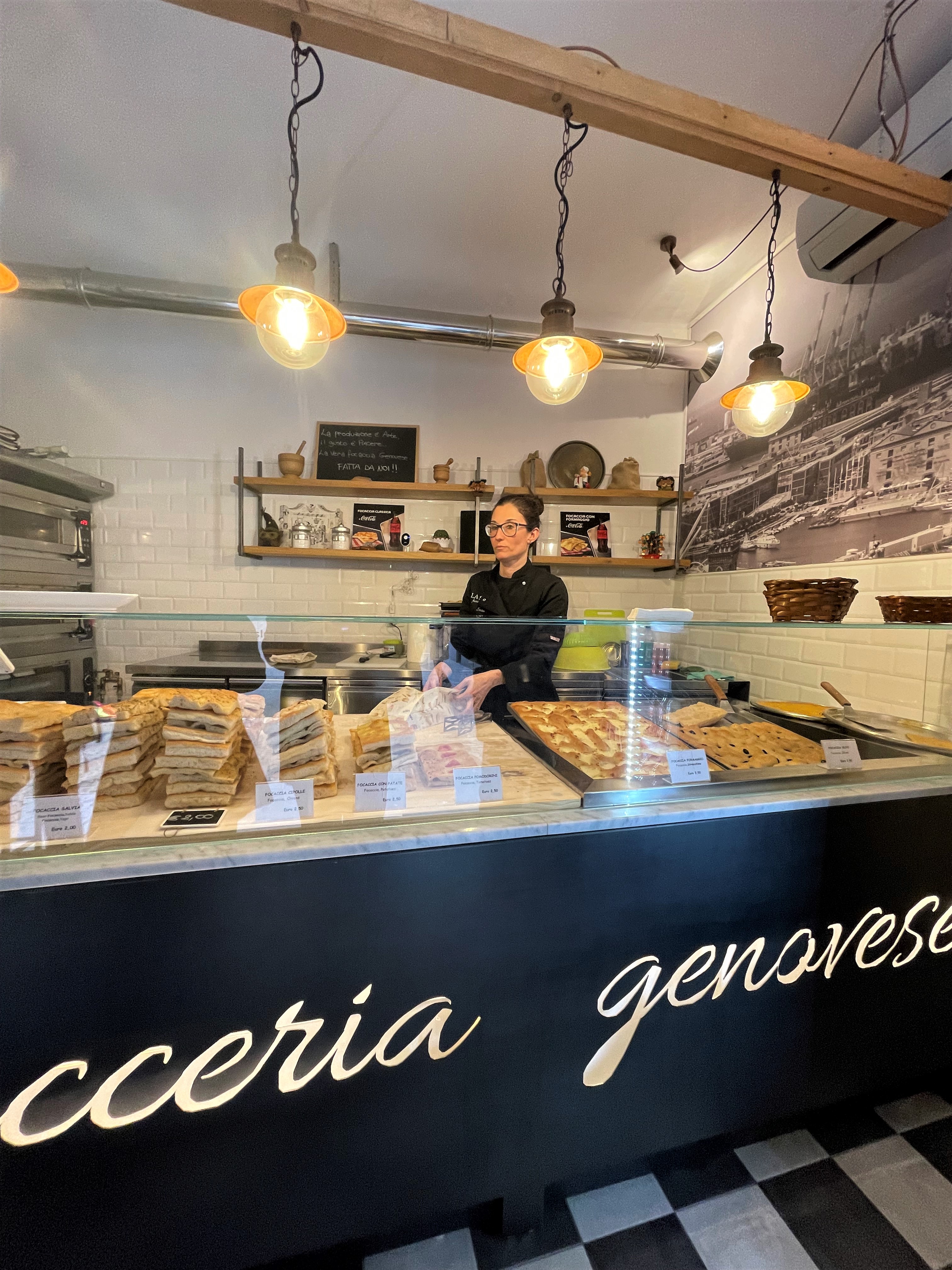 Una lavagnetta nel locale ricorda che “la produzione è Arte, il gusto è Piacere… la vera Focaccia Genovese fatta da noi”.