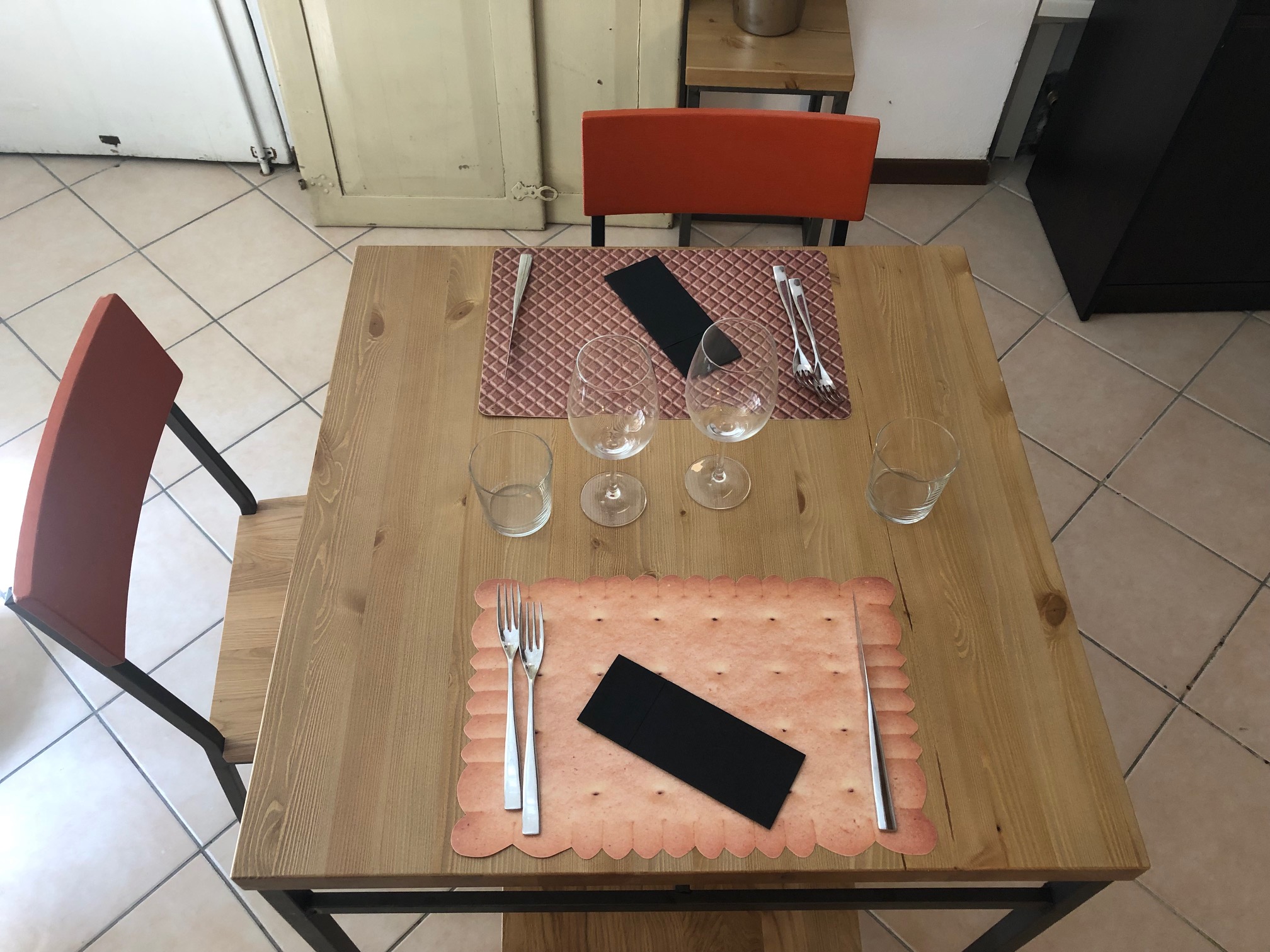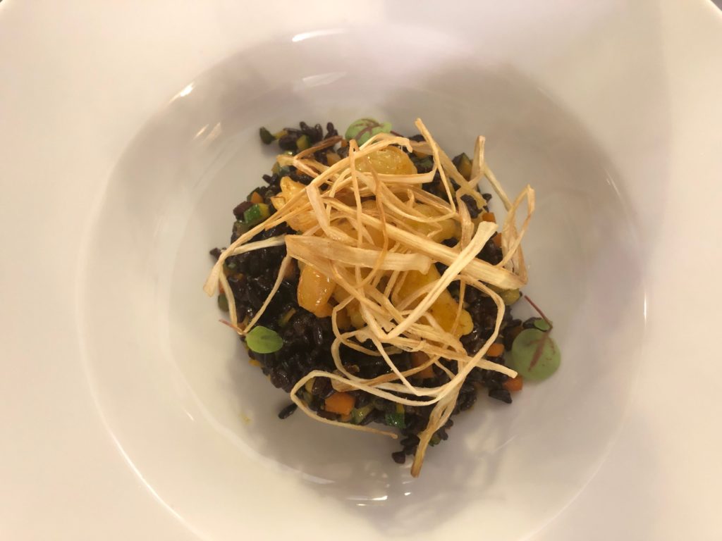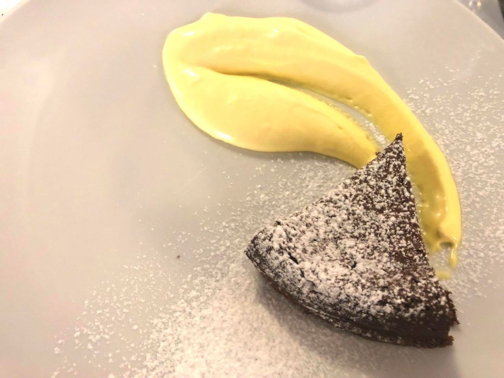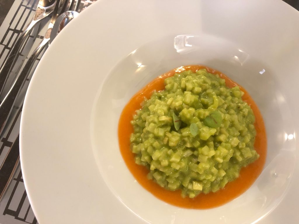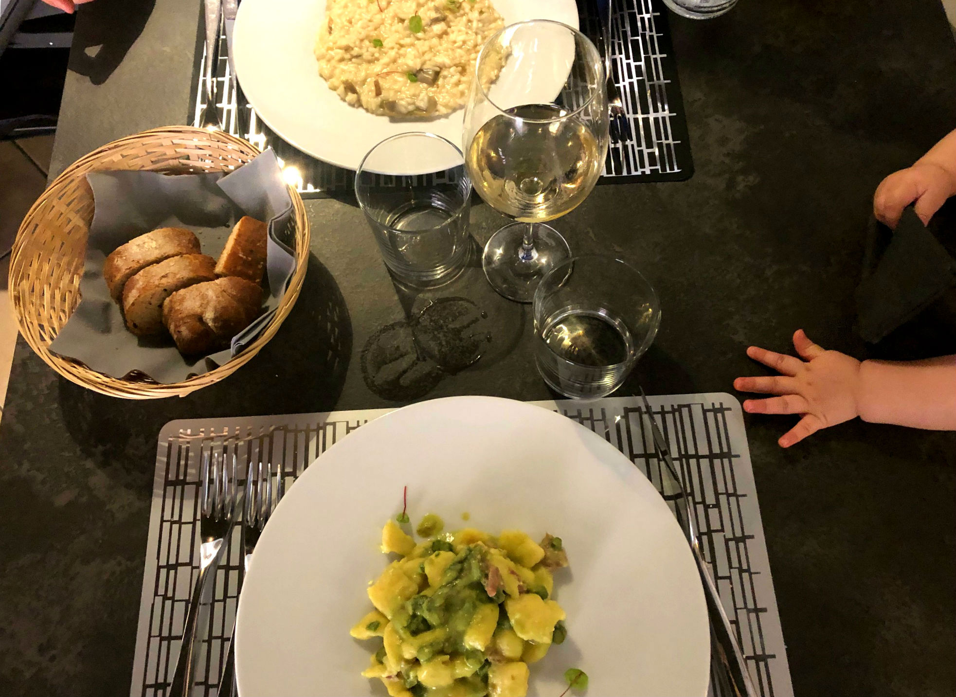 Sabato, dicevamo. La simpatia coinvolgente di Andrea, maitre di sala, le manine di Edera sul tavolo, il cestino del pane con la crescente e le nostre scelte. A partire da un piatto cult di Vottero: il Falso Farro, chicchi di sedano rapa tagliati a coltello, crema di zucchine e parmigiano reggiano 48 mesi. E poi, Riso nero, gamberi e verdure in salsa di curcuma, Altedo Chiama Tolè – gnocchi di patate Tolè con asparagi verdi di Altedo e prosciutto di Parma – e Sul Po, risotto ai carciofi mantecato alla robiola. Dolcezze sul finale, perché è impossibile nascondere il nostro essere golosi, con un semifreddo al mascarpone, la tenerina con crema sempre al mascarpone e la pinza bolognese.