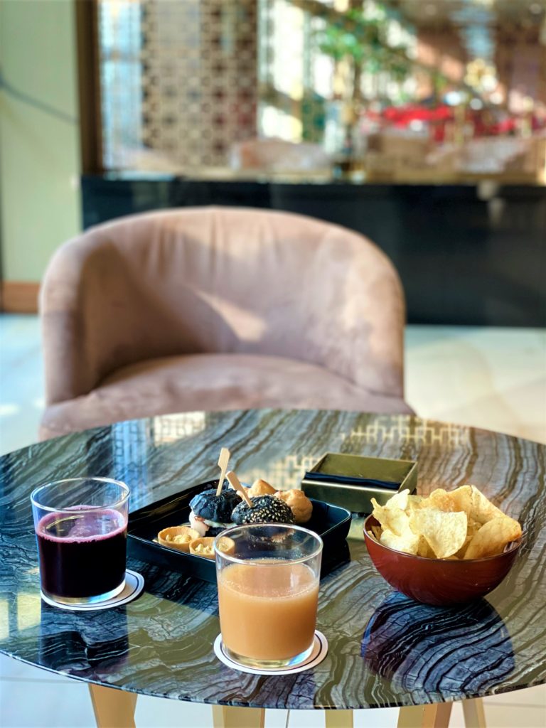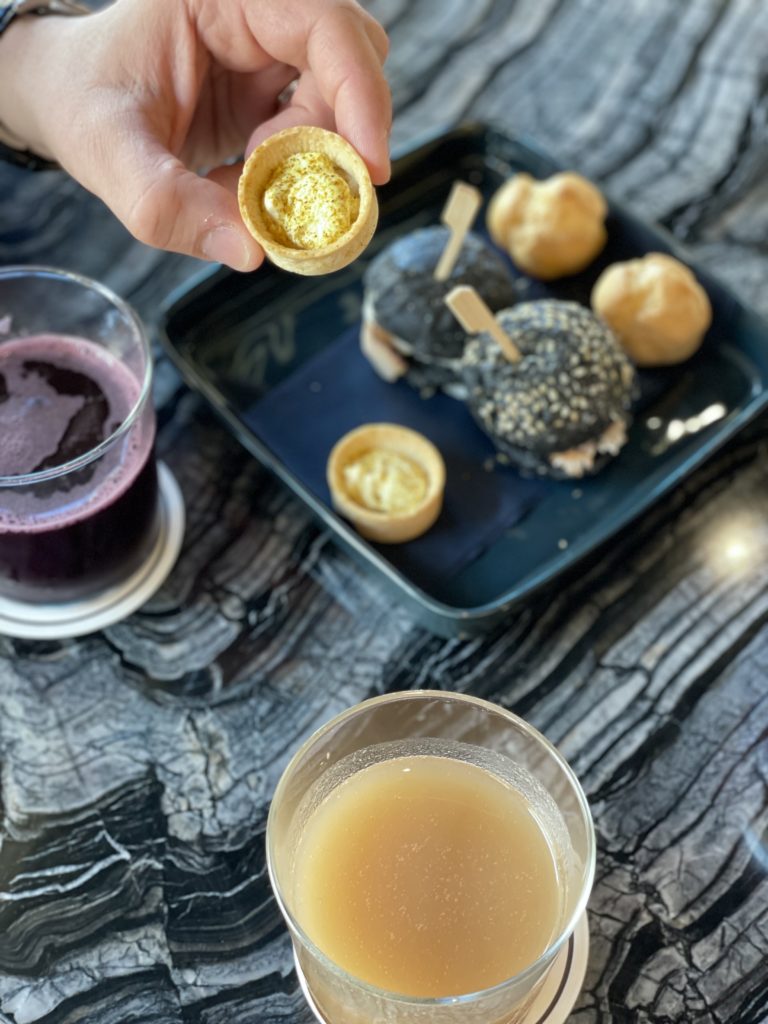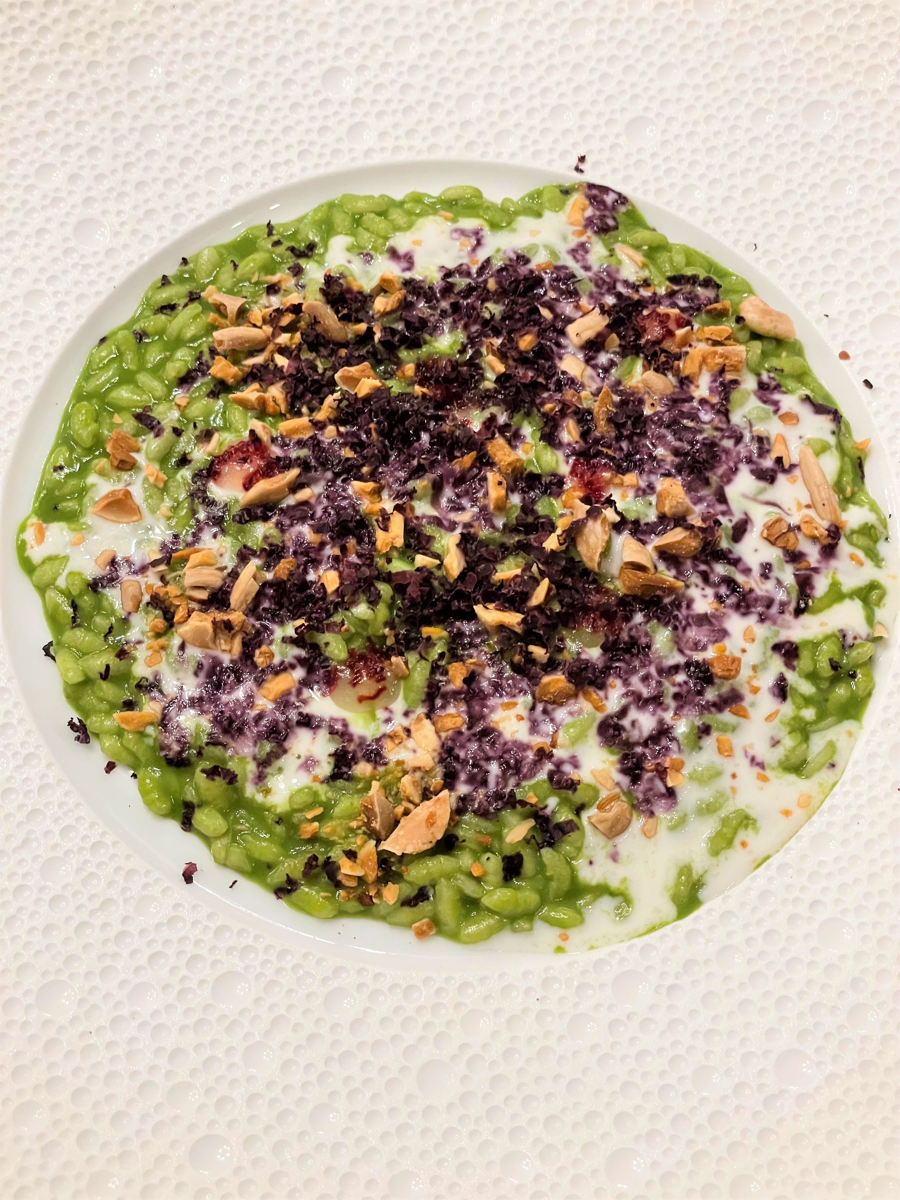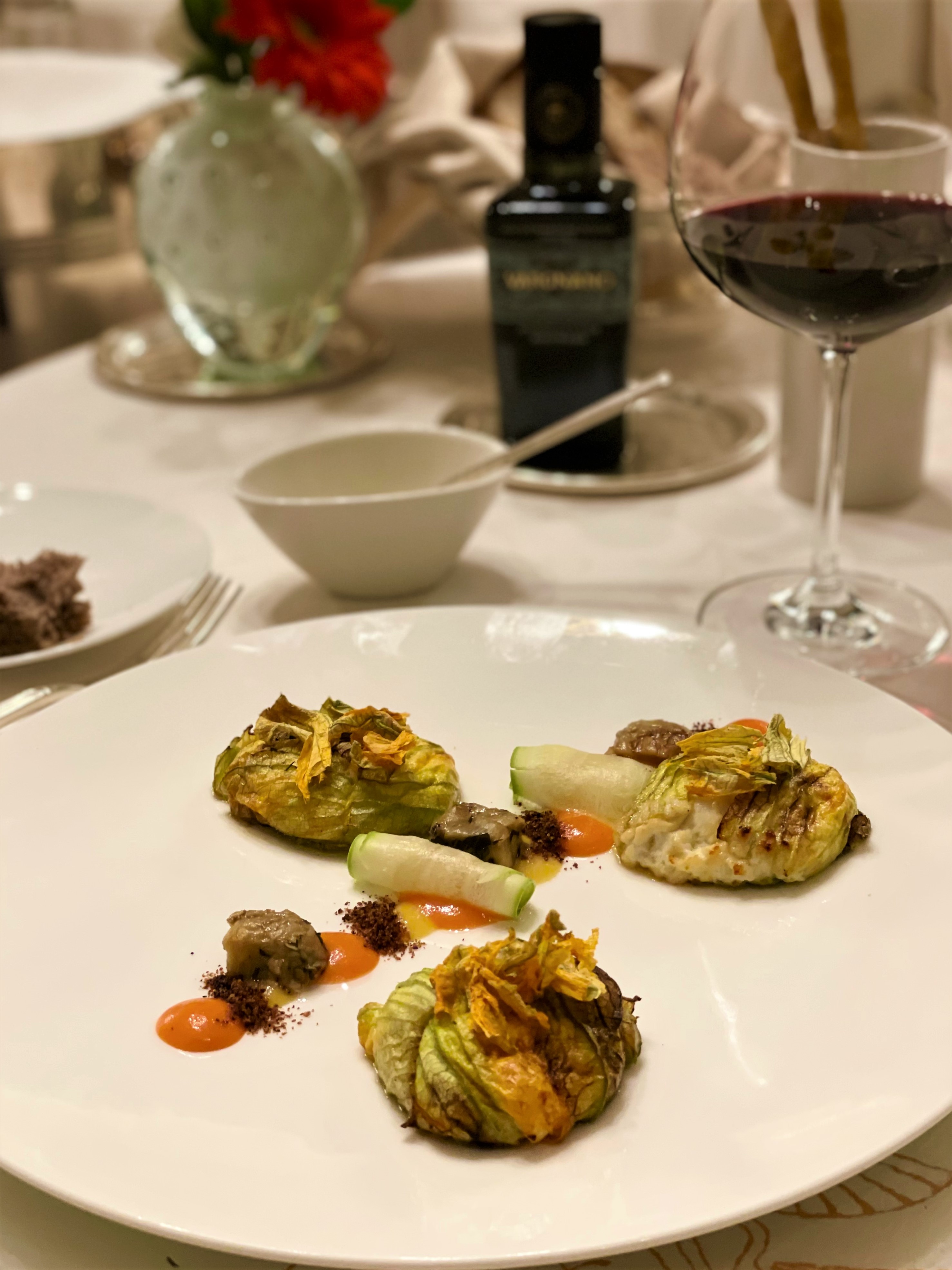 Tra le nostre scelte, i Gamberi Rossi di Sicilia, anguria, ostriche, yogurth e nocciola, e L’Orto in Fiore: fiori di zucca, ricotta di capra, verdure al carbon dolce. Indimenticabile il Riso del Podere Rio Rosso con erbe di campo aromatiche, mandorle, carota viola, il tutto rinfrescato dal gel di limone bruciato per conferire acidità al piatto. Come dessert, il Babà al liquore di zafferano e pesca in diverse consistenze – un impasto imbevuto nel liquore allo zafferano dell’orto del resort e unito alla pesca, presente in varie consistenze – e I Tre Cioccolati, arachidi e tartufo nero.