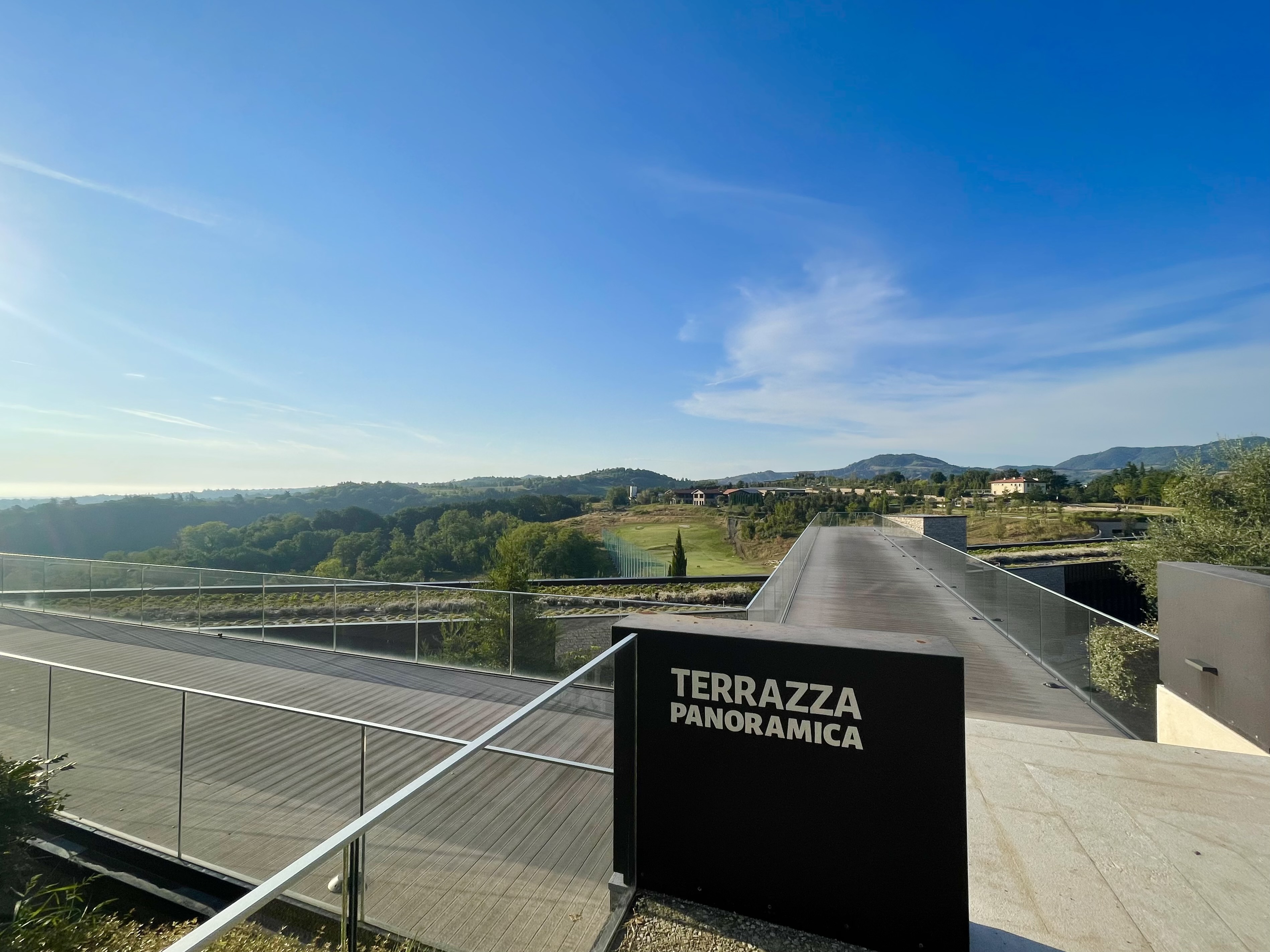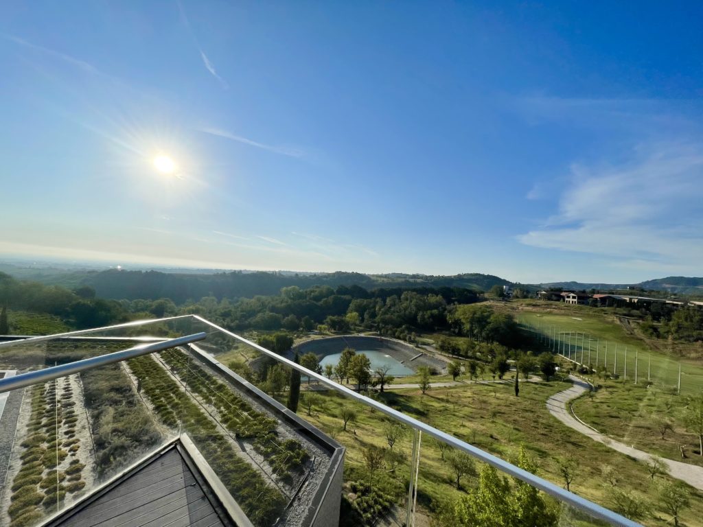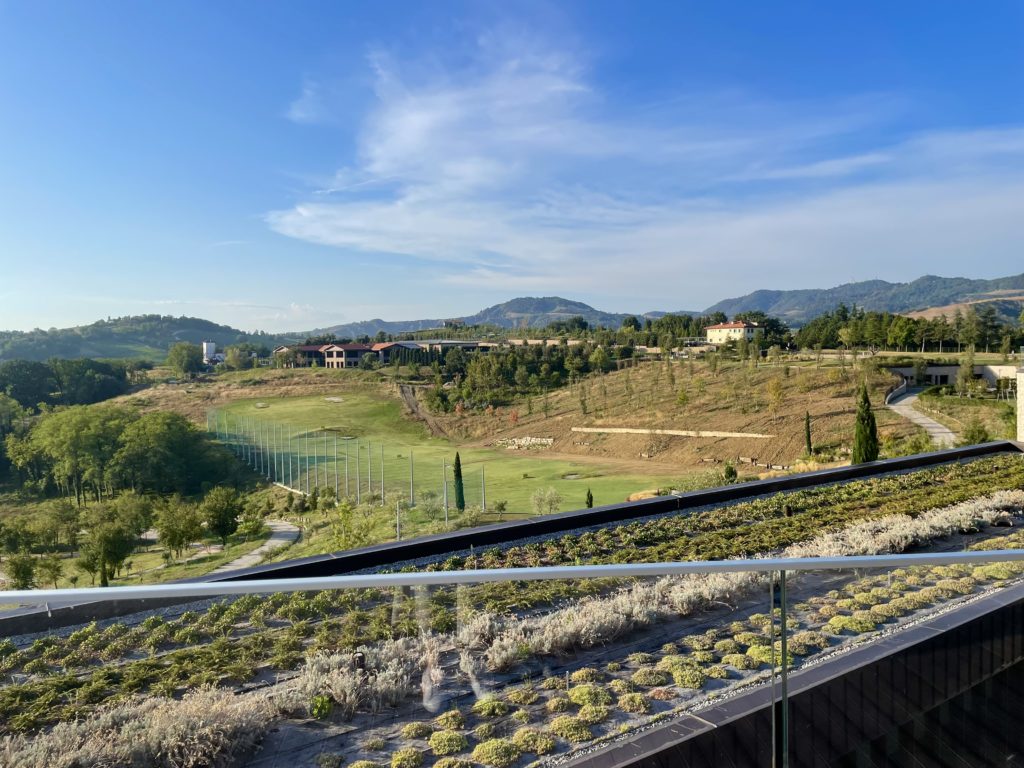 La magia silenziosa dei colli bolognesi l’abbiamo sperimentata sin dal nostro arrivo e ci ha decisamente colpito al mattino quando, svegliandoci, ci siamo trovati di fronte a un quadro vivente. Quello che ci offriva la vista della nostra Camera Deluxe Prestige. Riservatezza, colori caldi e brillanti, arredi design, grandi vetrate.