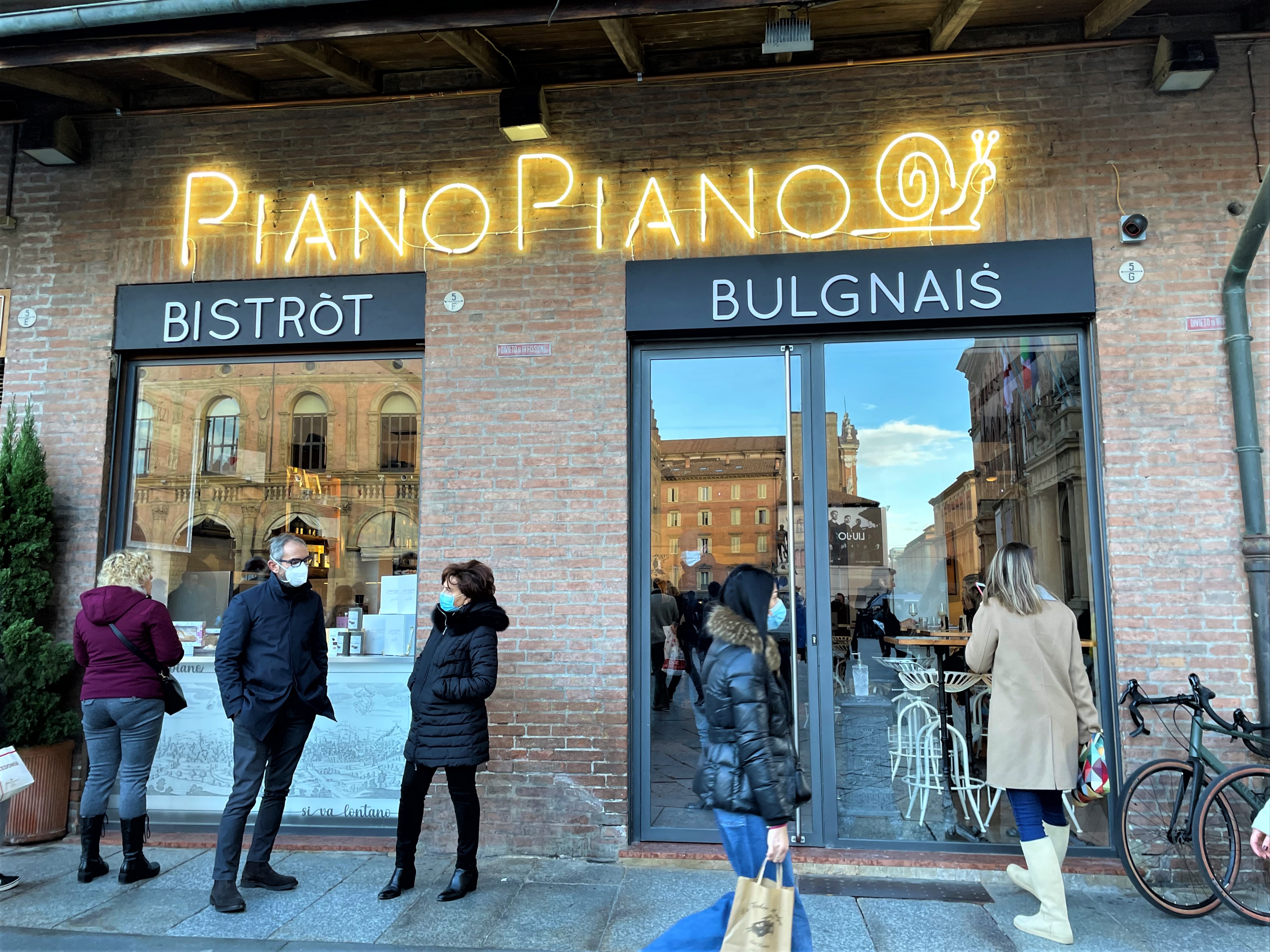 Molto più di un bar ristorante. Piano Piano è l’inizio di storie e racconti del territorio bolognese che si intrecciano in una location straordinaria: tre livelli che si affacciano su Piazza Maggiore e via D’Azeglio, proprio dove un cippo indica la partenza della Via degli Dei e il centro geografico esatto di Bologna città.