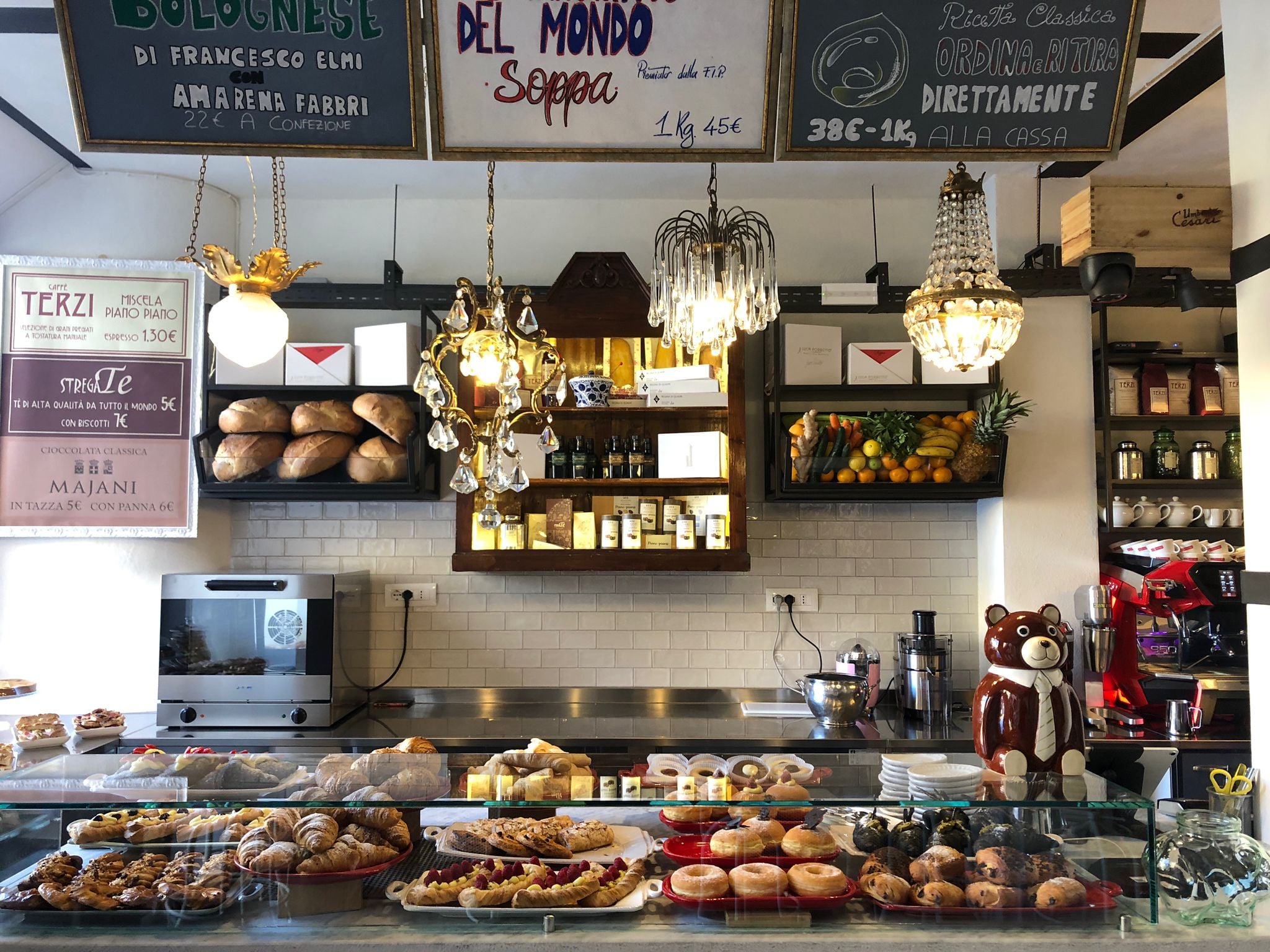 La pasticceria è di produzione propria, con l’apporto di Francesco Elmi, pluripremiato accademico bolognese, e Maestro Pasticcere, per la tradizionale “pinza” bolognese. La carta del bar è curata da Francesco Trimigno, recentemente premiato con 3 bicchieri dalla rivista Gambero Rosso, come migliore bartender della regione, tra i primi 10 di Italia.