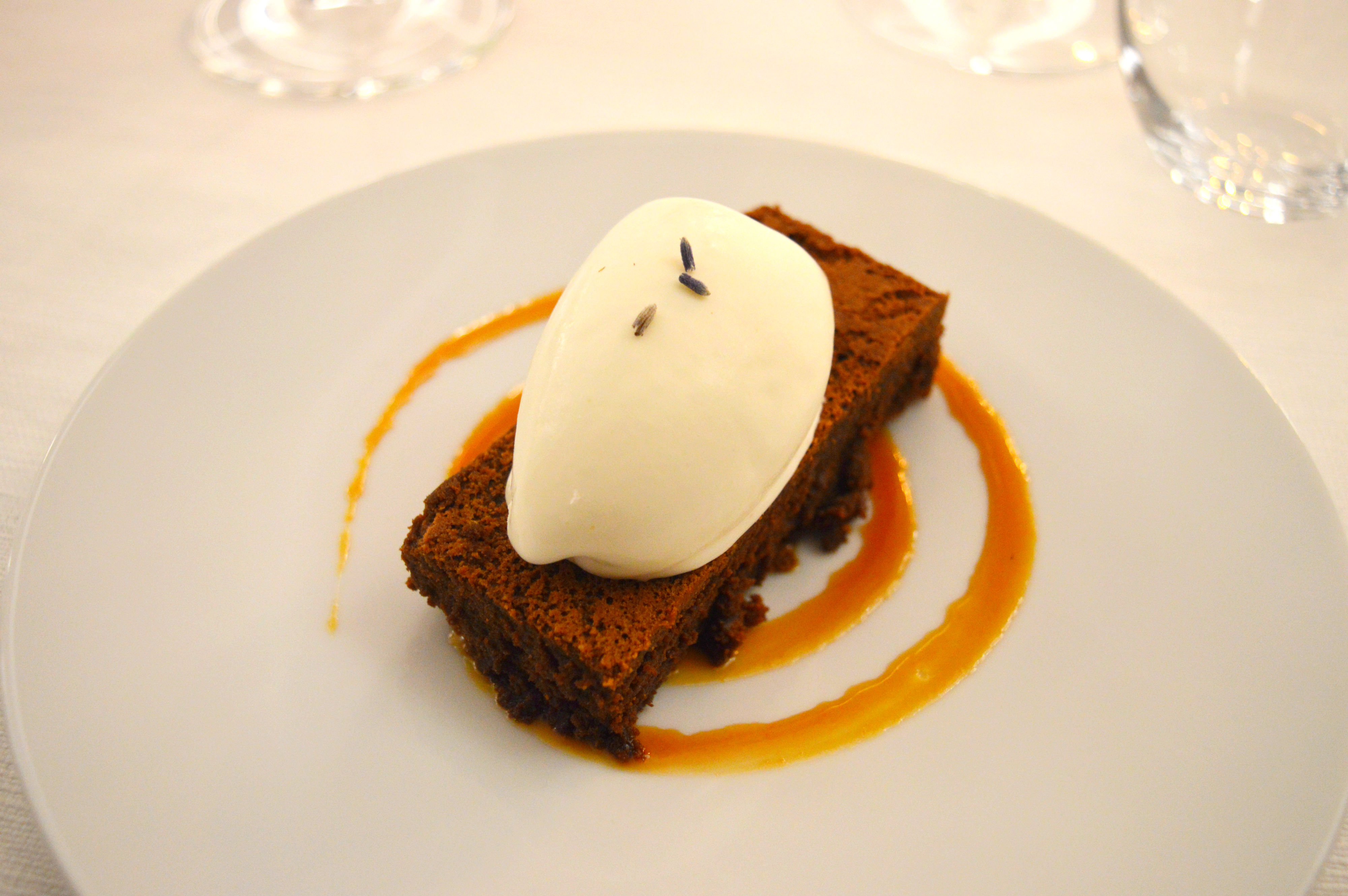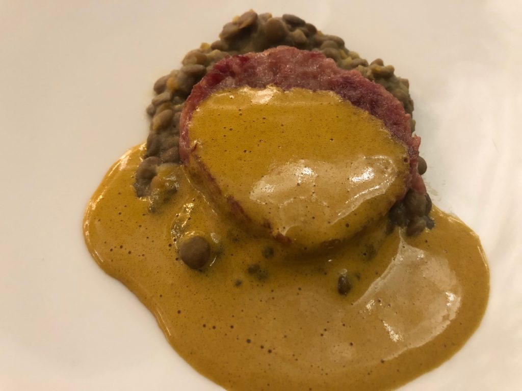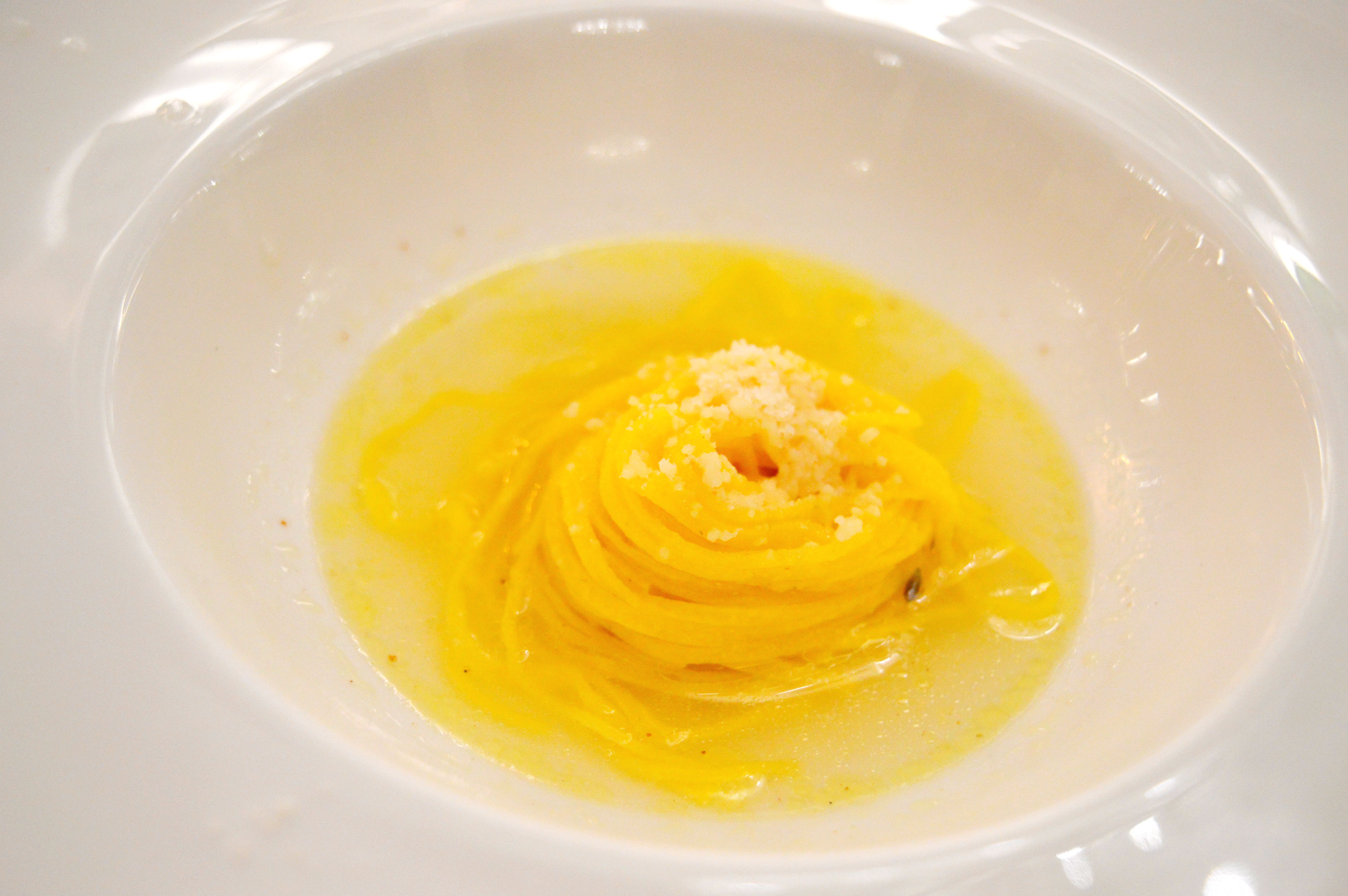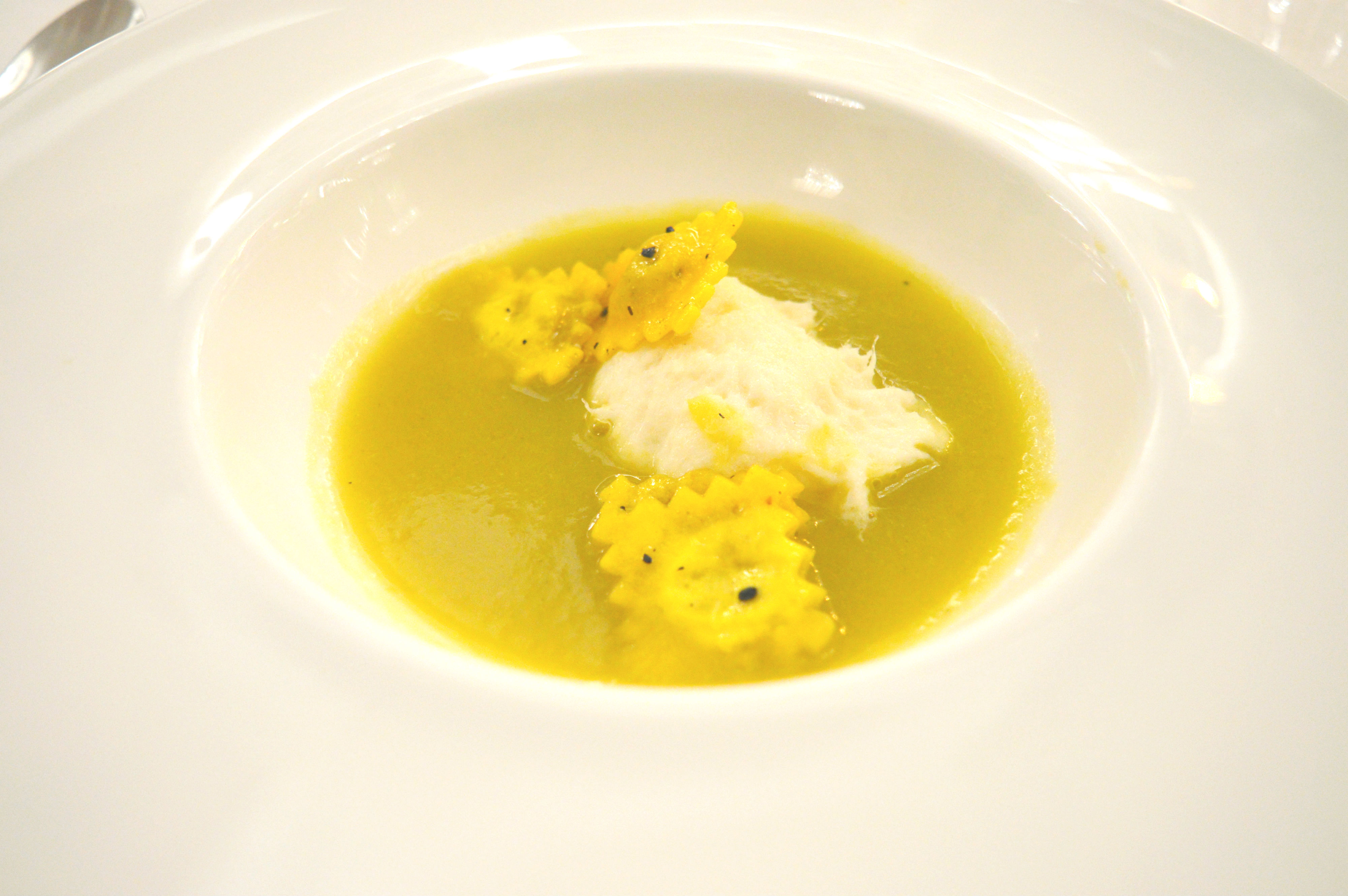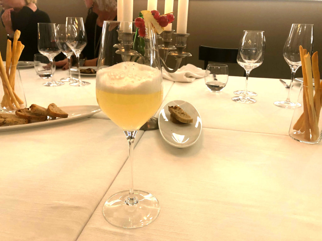 Un calice di rosé di Cantina Della Volta come benvenuto. Crudo di seppia in salsa di soia e lime con zucchine a scapece, anguilla gratinata al pecorino su polenta tenera con gocce di cavolo nero e limone, capasanta e vongole al vapore con puré di sedano rapa e radicchio trevigiano saltato, passatelli in brodo di pesce con scampi, vongole e olive taggiasche, sogliola alla mugnaia con indivia brasata e pane croccante e finale con gelato al panettone in salsa al mandarino caramellato e brunoise di tenerina con polvere di caffè e tartufo nero.