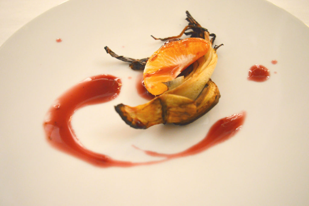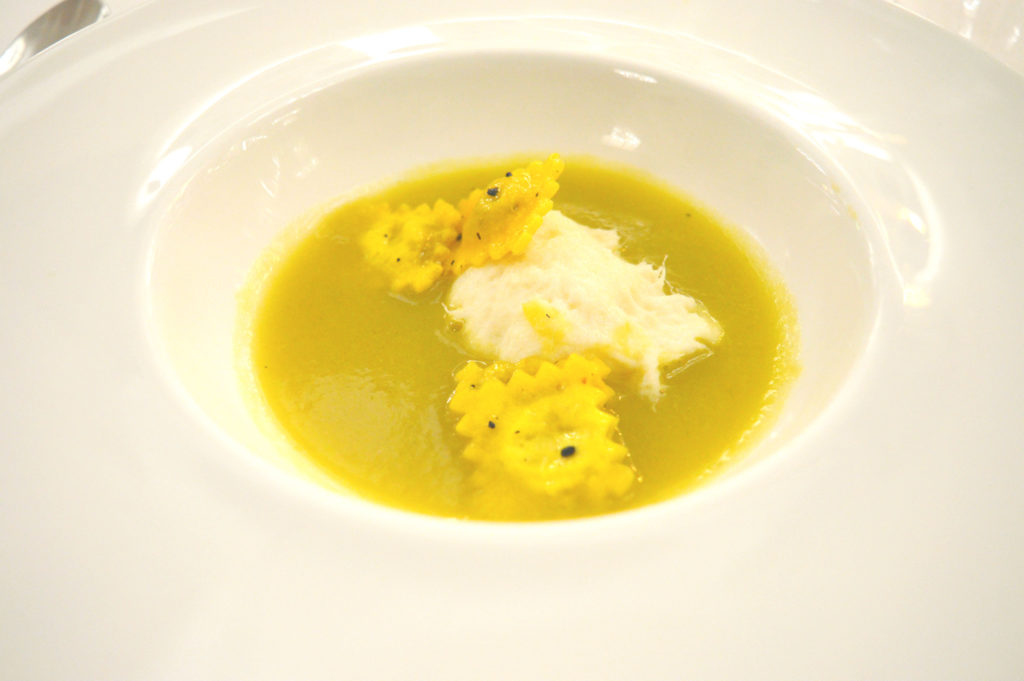 La serata che conclude e l’anno e brinda a quello nuovo si apre con brioche al vapore con maionese al tartufo bianco con tortellini fritti e spuma di parmigiano. Seguono gamberi rossi crudi al latte di mandorla con gocce di peperoni arrostiti e fiori eduli, zuppa di lenticchie, scampi e spuma con fegato d’oca e mandarino caramellato, tortelli di zucca con brunoise di strolghino e salsa al tartufo nero e polvere di caffè, cotechino ripassato con zabaione al Lambrusco e nocciole di Piemonte, crema di yogurt con uva, gocce di pistacchio e meringa allo zafferano. Per concludere in bellezza, brodo di mandarino, sandwich di panettone gelato al cacao e scaglie di torrone.