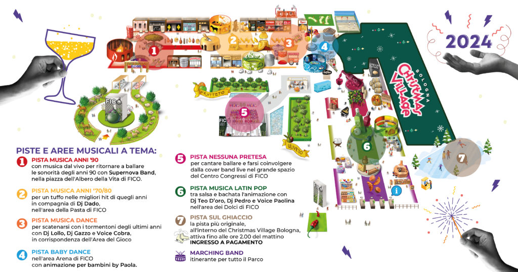 E ancora, balli e divertimento per tutti. Con sette piste da ballo che variano dalle sonorità anni ’70 e ’80, dalla cover band i Nessuna Pretesa alla musica latina e alle hit degli anni ’90, fino a una Pista del Ghiaccio in Musica nel Christmas Village Bologna, c’è solo l’imbarazzo della scelta per ballare tutta la notte. E i più piccoli potranno divertirsi con la Baby Dance nell’Arena di FICO.