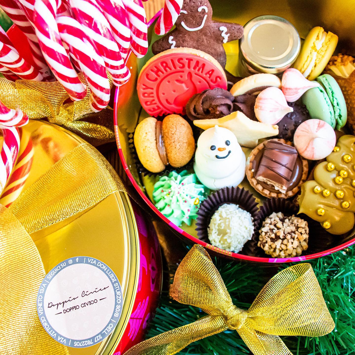 The Christmas Box 2021 è una delle proposte per questo Natale di Doppio Civico. Il box in latta comprende tante specialità: Biscotto Pan di Zenzero, 2 Macarons, Cannolo siciliano al cioccolato bianco, Brownie al pistacchio, Bacio di Dama, 2 Tartufi, Tartelletta Bakery, Biscottini Pastafrolla, Biscotto Pasta di Zucchero, Pralina Ripiena, Vasetto crema alla nocciola, Meringhe natalizie, Candy Canes.