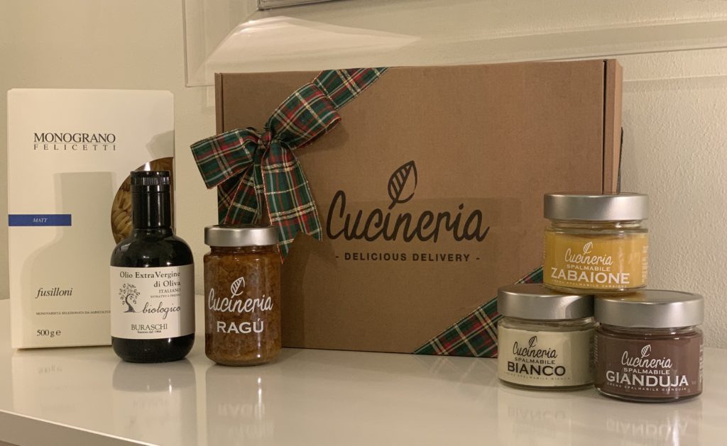 Cucineria Christmas Box è la proposta natalizia di Cucineria. All’interno, una confezione in astuccio di fusilli monograno del Pastificio Felicetti, una bottiglia 250ml di olio biologico del Frantoio Buraschi di Montepulciano (olio menzionato nella guida “oli d’Italia 2021” stilata da Il Gambero Rosso). A concludere la box, due prodotti a marchio Cucineria: un vasetto di crema spalmabile artigianale a scelta tra zabaione (perfetto a Natale con Pandoro e Panettone), cioccolato bianco e gianduja, ed un vasetto del Ragù di produzione Cucineria. Il costo è di 30€. Come opzione, con un sovrapprezzo di 2,5€ sarà possibile avere un vasetto grande di ragù (300gr invece di quello standard di 200gr).