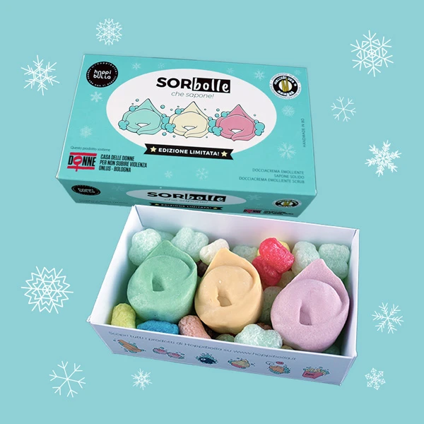 Nuove esperienze sensoriali, ludiche e creative. A proporle è HoppiBOlla, il progetto di Beatrice e Francesca, sorelle bolognesi con la passione per la cosmesi. I loro prodotti – solidi, eco-friendly e made in BO – stravolgono e ribaltano quella che è una cultura consolidata, particolarmente in Italia, del naturale e del biologico come concetti inscatolati all’interno di una visione formale, basica e monodimensionale. Qui bombe da bagno, shampoo, lozioni corpo e bagnoschiuma assumono le forme più variegate. L’ultimo esempio è SORbolle, delizioso Kit di Natale contenente il Sapone corpo solido Tortellino AUMENTATO super idratante, il Balsamo corpo scrub Tortellino AUMENTATO dall’effetto setificante, e in esclusiva nonché in edizione limitata, il maestoso e golosissimo Balsamo doccia solido BALANZONE dal potere emolliente e superidratante al profumo di pistacchio. Da un’idea nata in collaborazione con Succede solo a Bologna, parte del ricavato del kit viene devoluto alla Onlus CASA DELLE DONNE-PER NON SUBIRE VIOLENZA che offre ascolto, accoglienza e aiuto alle donne vittime di violenza.