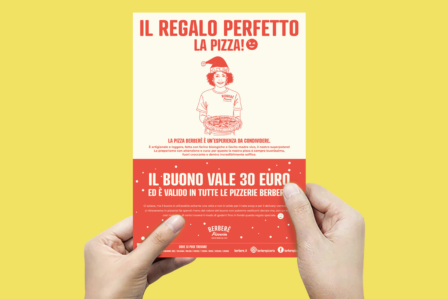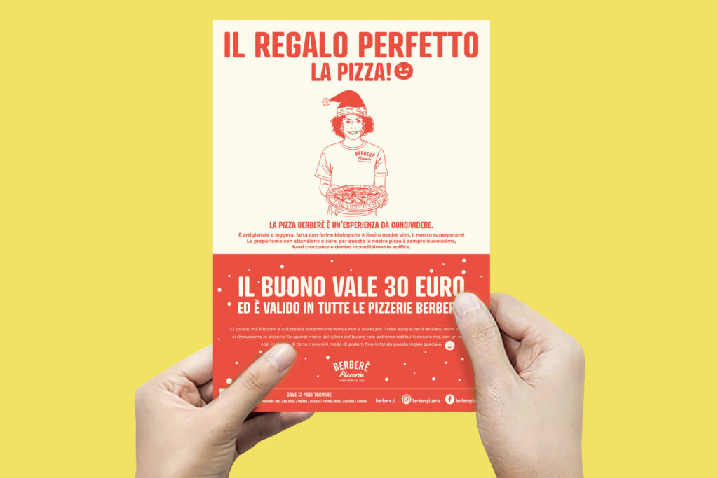 Per tutti i Berberè Lovers, un buono è il regalo perfetto per Natale. Vale infatti 30€, ma si compra scontato a 25€ per regalare così la possibilità di gustare la super pizza Berberè in uno dei 15 locali. E ormai lo sappiamo bene: la pizza Berberè è un’esperienza da condividere.
