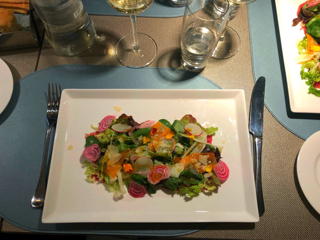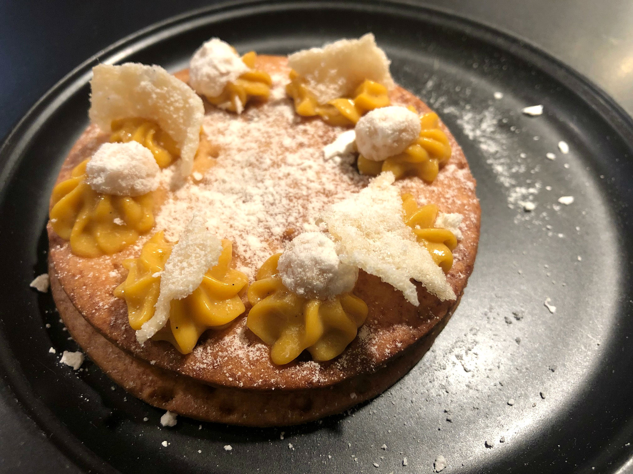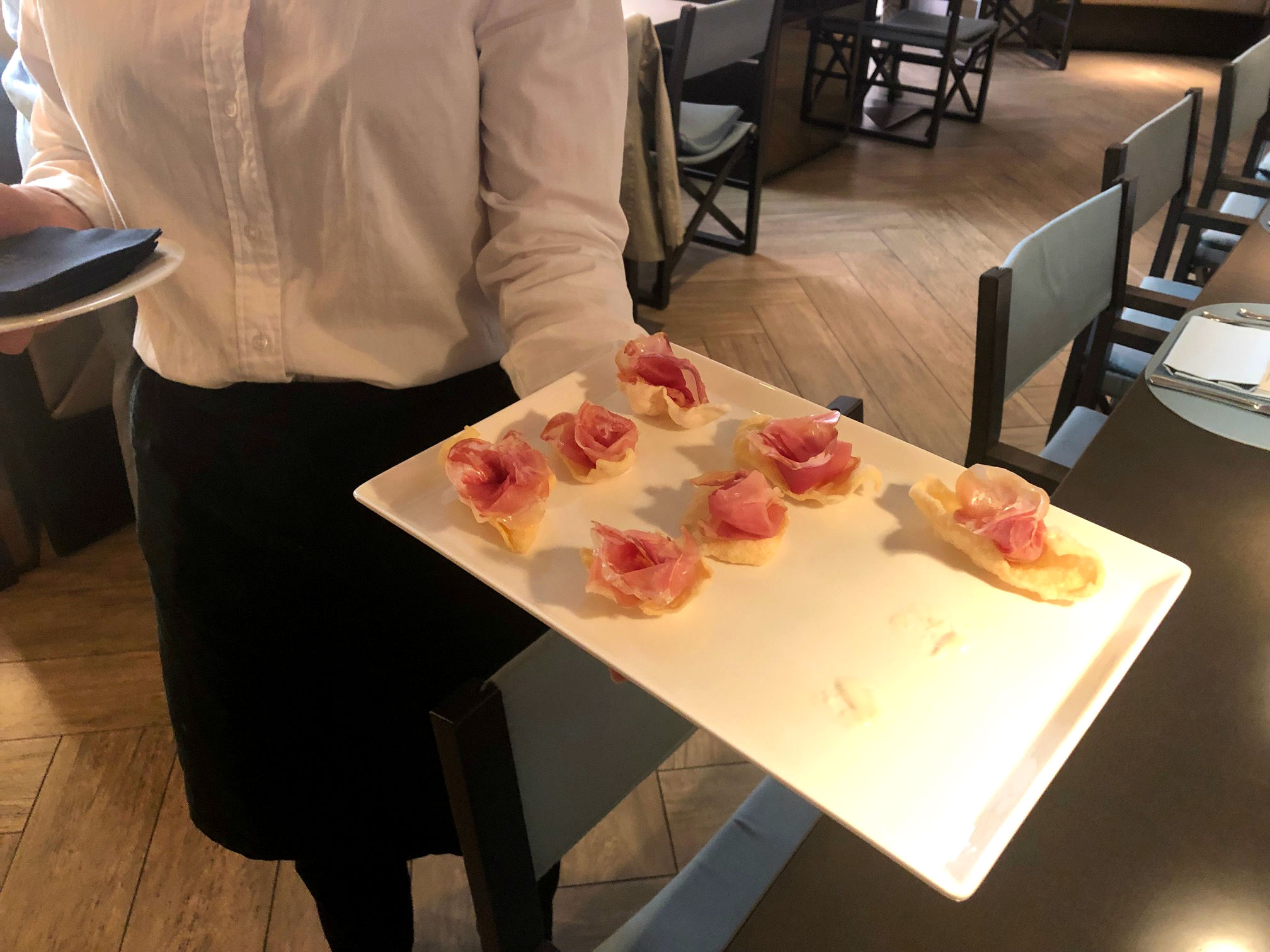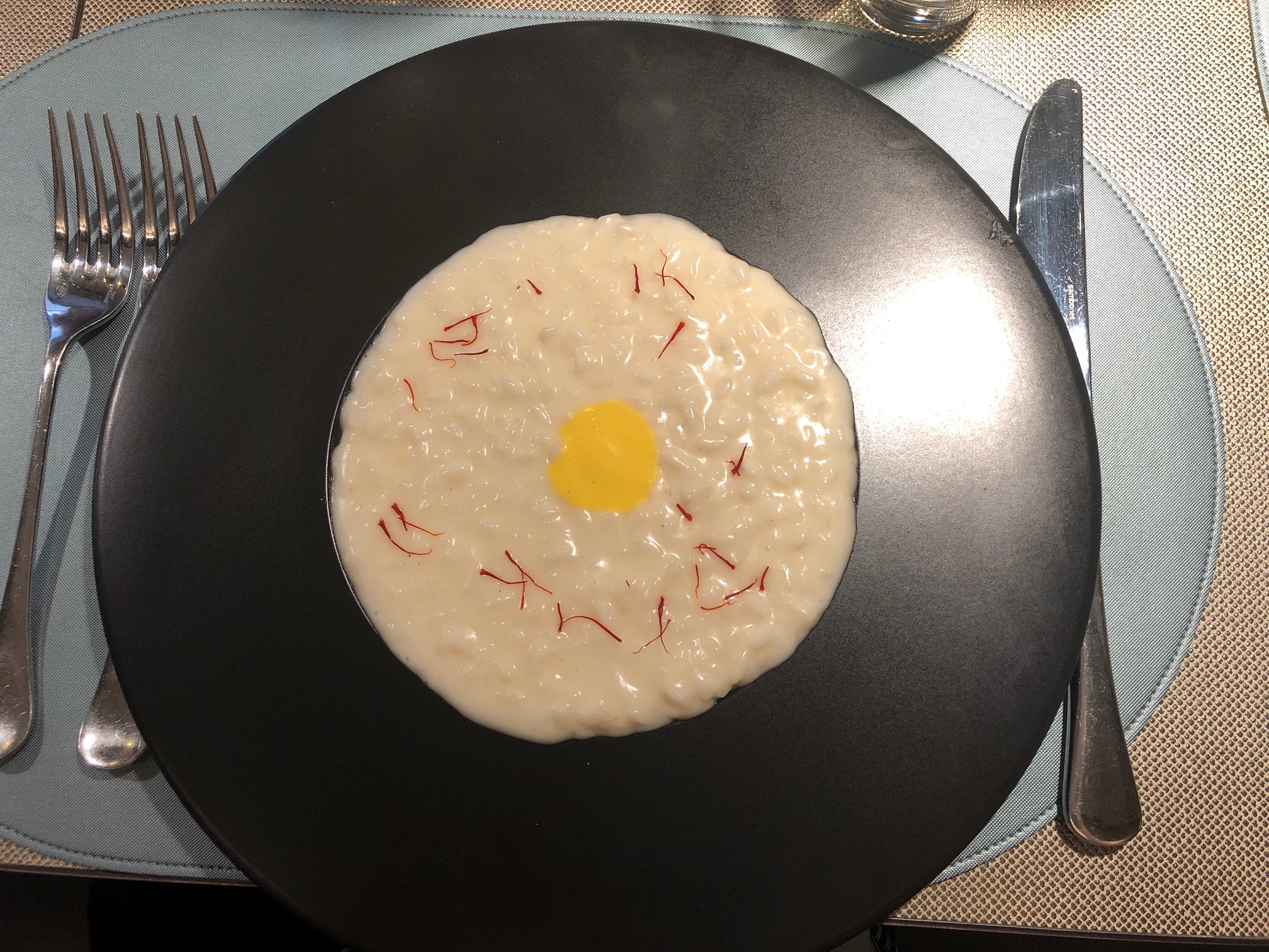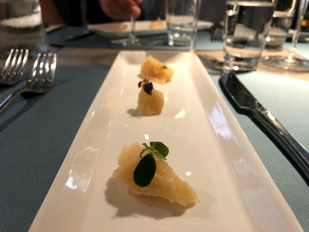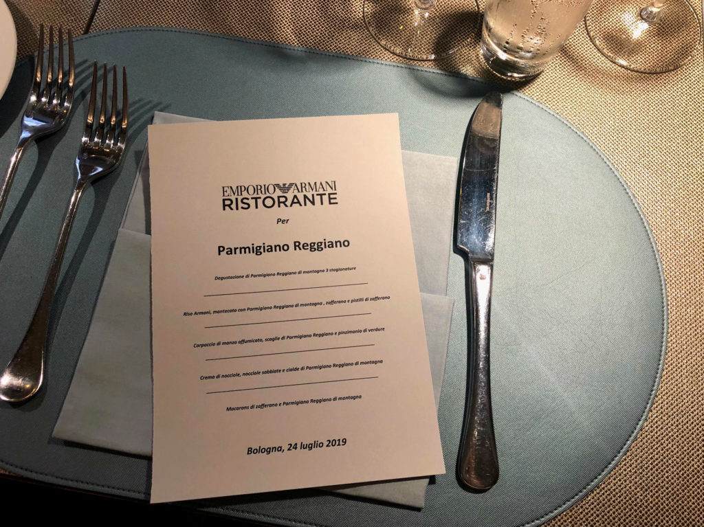 Degustazione di Parmigiano Reggiano di montagna 3 stagionature; Riso Armani, mantecato con Parmigiano Reggiano di montagna, zafferano e pistilli di zafferano; Carpacco di manzo affumicato, scaglie di Parmigiamo Reggiano e pinzimonio di verdure; Crema di nocciole, nocciole sabbiate e cialde di Parmigiano Reggiano di montagna; Macarons di zafferan e Parmigiano Reggiano di montagna.