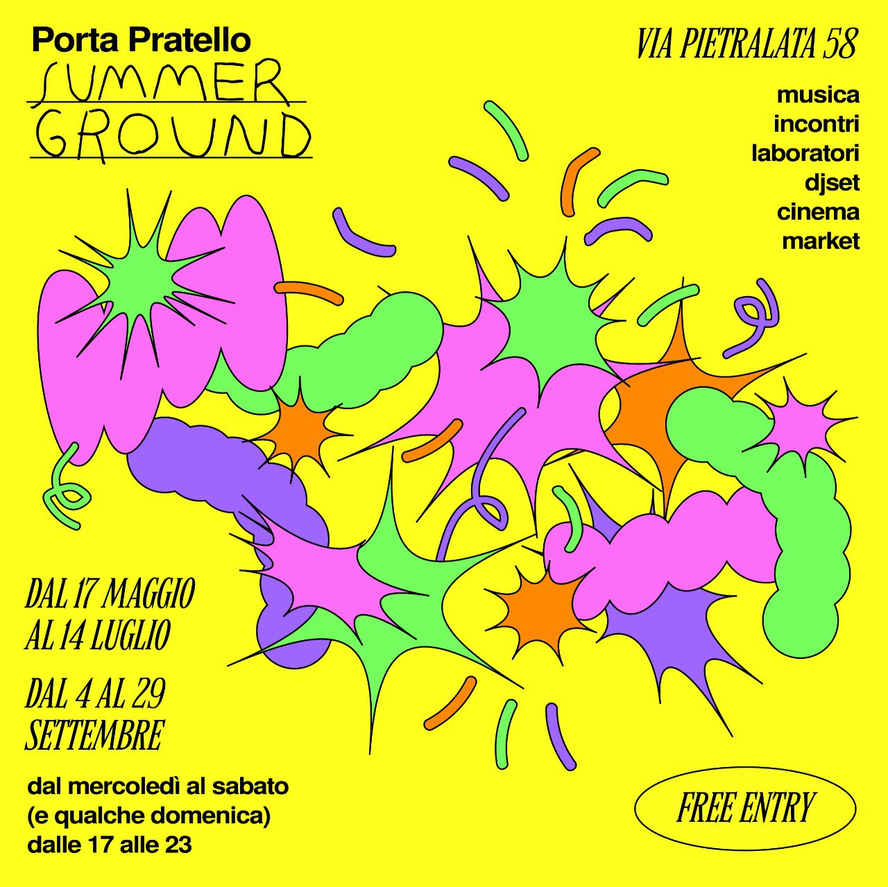 Dal mercoledì al sabato, e qualche domenica, dalle 17 alle 23 la corte di Pietralata 58 ospiterà artistə, scrittrici e scrittori, registi internazionali, musica live e djset dalla scena italiana e bolognese.