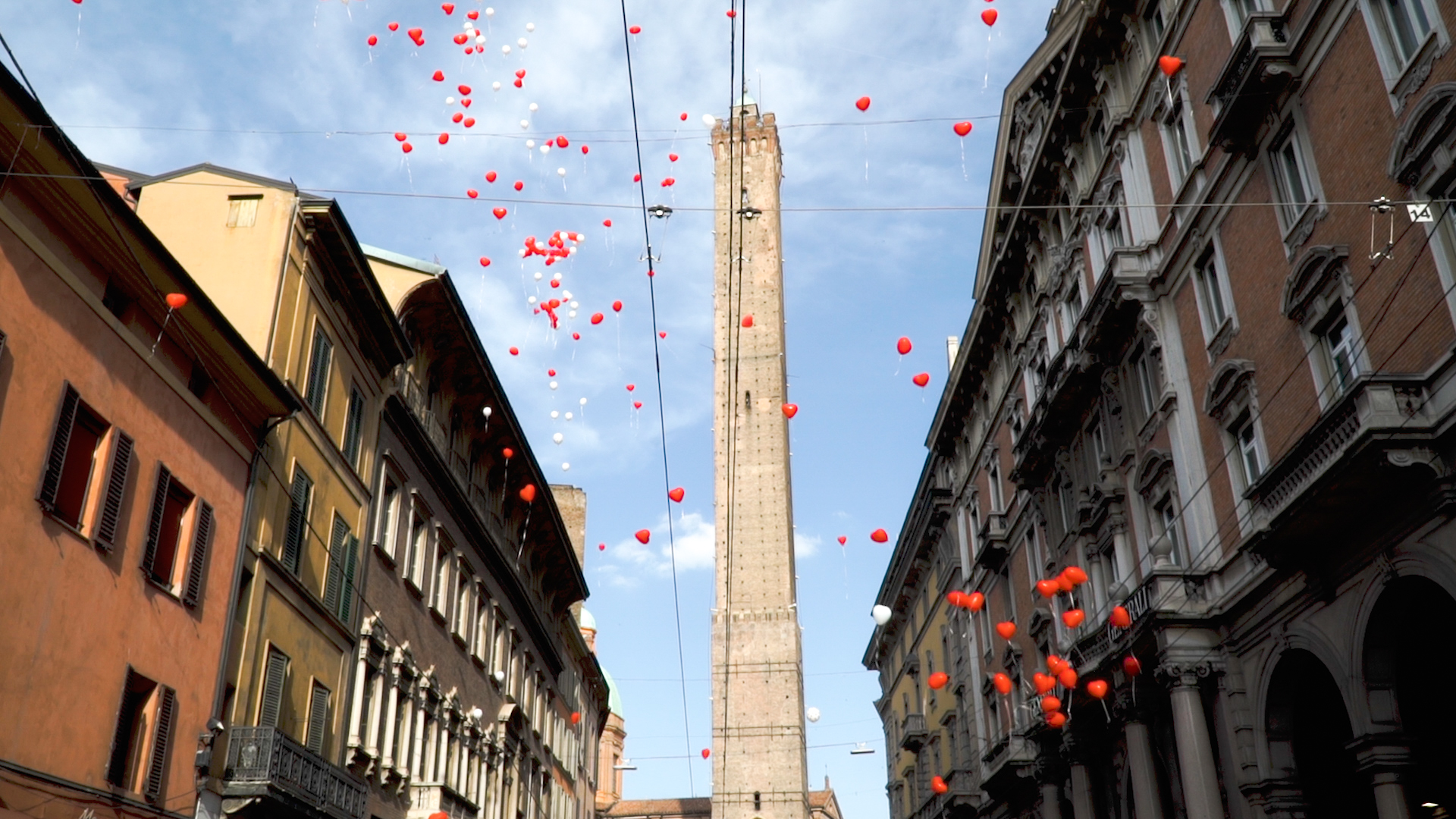 Sullo sfondo, via Rizzoli invasa da centinaia di palloncini a forma di cuore e da uno striscione di 50 metri con su scritto “MI SPOSY?”.