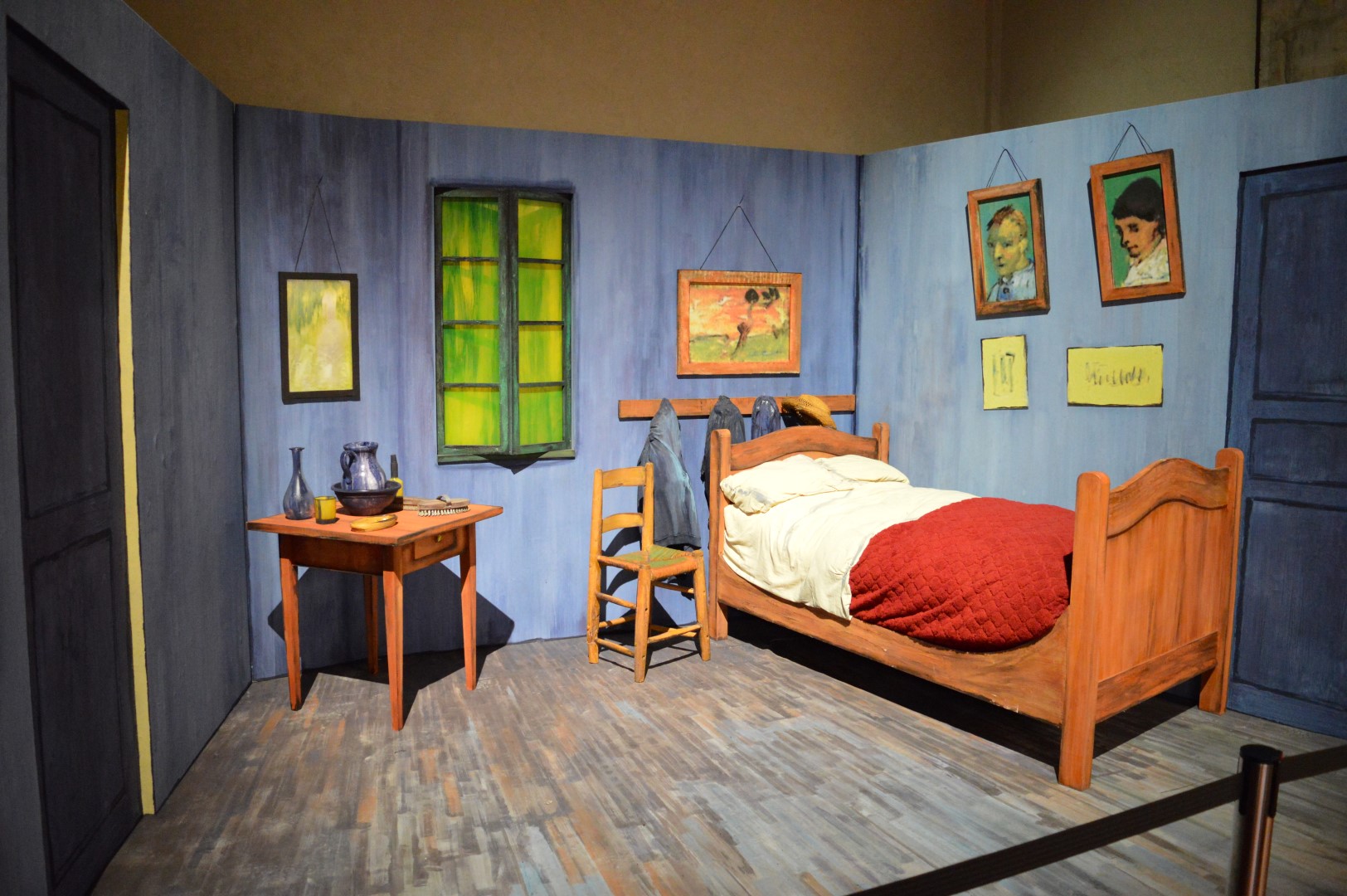 Pochi passi per giungere alla riproduzione de “La camera di Vincent ad Arles”. In una lettera all’amico Paul Gauguin, l’artista scrisse: “Ho fatto, sempre come decorazione, un quadro della mia camera da letto, con i mobili in legno bianco, come sapete. Ebbene, mi ha molto divertito fare questo interno senza niente, di una semplicità alla Seurat; a tinte piatte, ma date grossolanamente senza sciogliere il colore; i muri lilla pallido; il pavimento di un rosso qua e là rotto e sfumato; le sedie e il letto giallo cromo; i guanciali e le lenzuola verde limone molto pallido; la coperta rosso sangue, il tavolo da toilette arancione; la catinella blu; la finestra verde”.